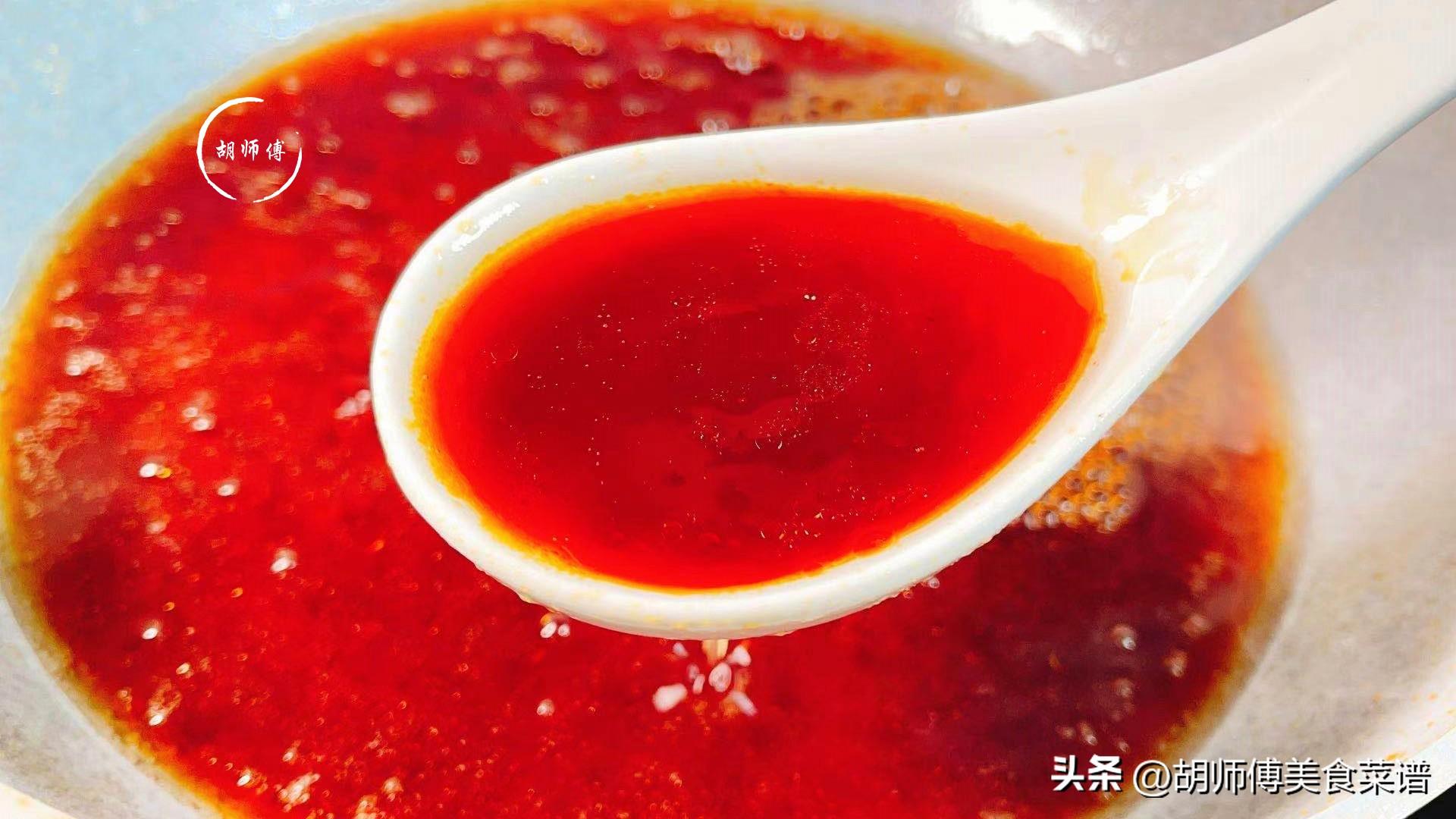 第二步:鍋中放入一勺油,然後把冰糖放入鍋中後,不斷翻炒糖,直到糖變成深色的大魚眼泡泡,立即將一碗熱水放入鍋中,等糖煮融化後即可倒入碗中備用。