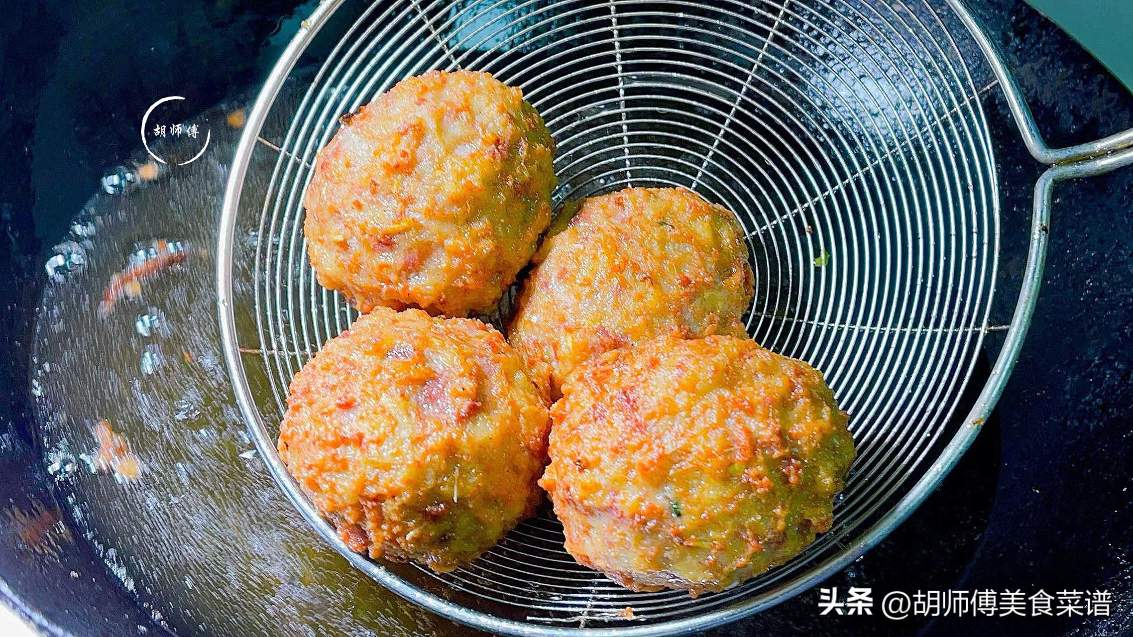 第二步:鍋中放入適量油,等油燒到5成熱後,將肉末擠成丸子放入鍋中,大火將丸子表面炸成金黃色即可起鍋。