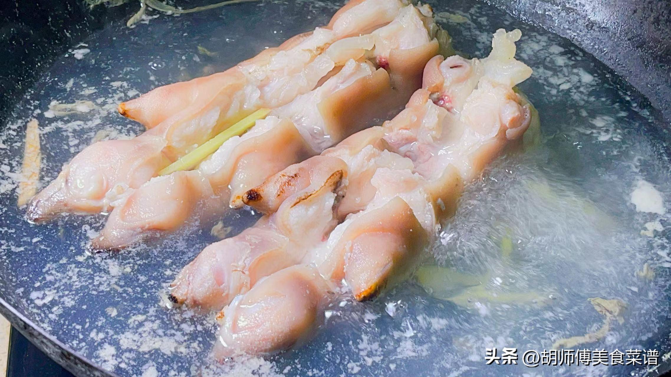 第一步:將豬蹄表面劃一個口,然後把豬蹄放入冷水中浸泡6小時後撈出,接着再把豬蹄、適量冷水放入鍋中,大火將豬蹄焯水15分鐘後撈出,最後再用清水將豬蹄洗淨。