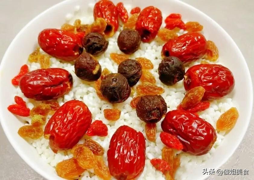3、果乾的搭配:除了上面提到的,你還可以加入蓮子、核桃仁、杏仁等,做成真正的“八寶”,口感更豐富。