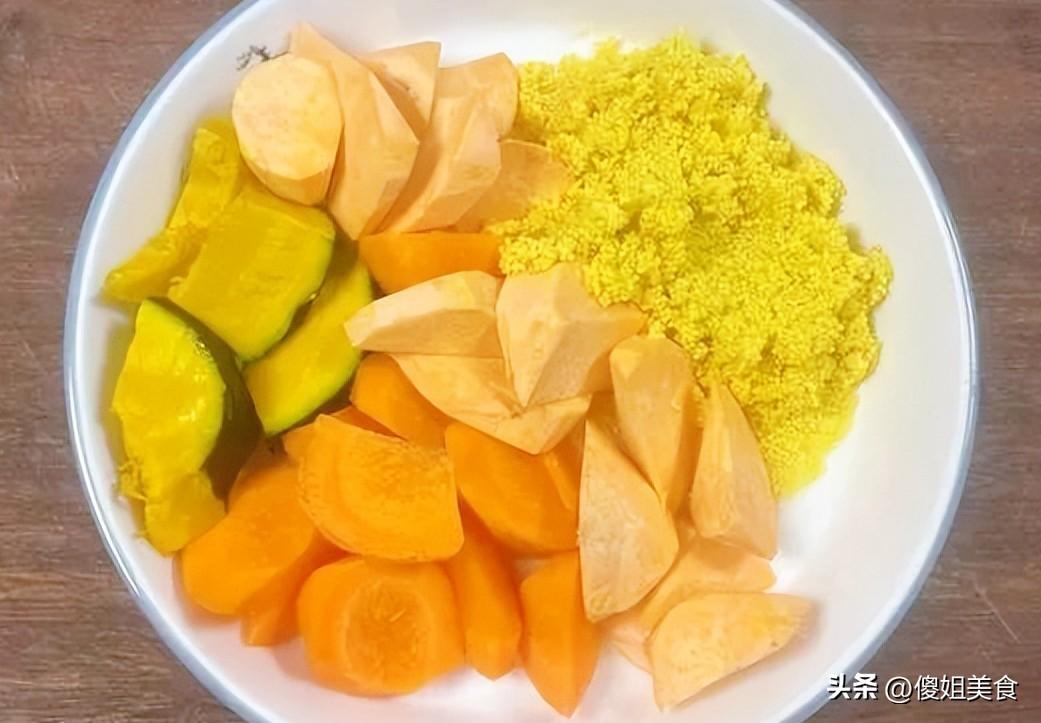 除了包子,婆婆還用豆漿機打了一鍋“黃金米糊”。爲啥叫“黃金米糊”呢?因爲用料都是金黃色的:胡蘿蔔、地瓜、南瓜,再加一把小米。這幾樣東西放在一起,打出來的米糊顏色特別漂亮,是那種溫暖的、濃稠的金黃色。