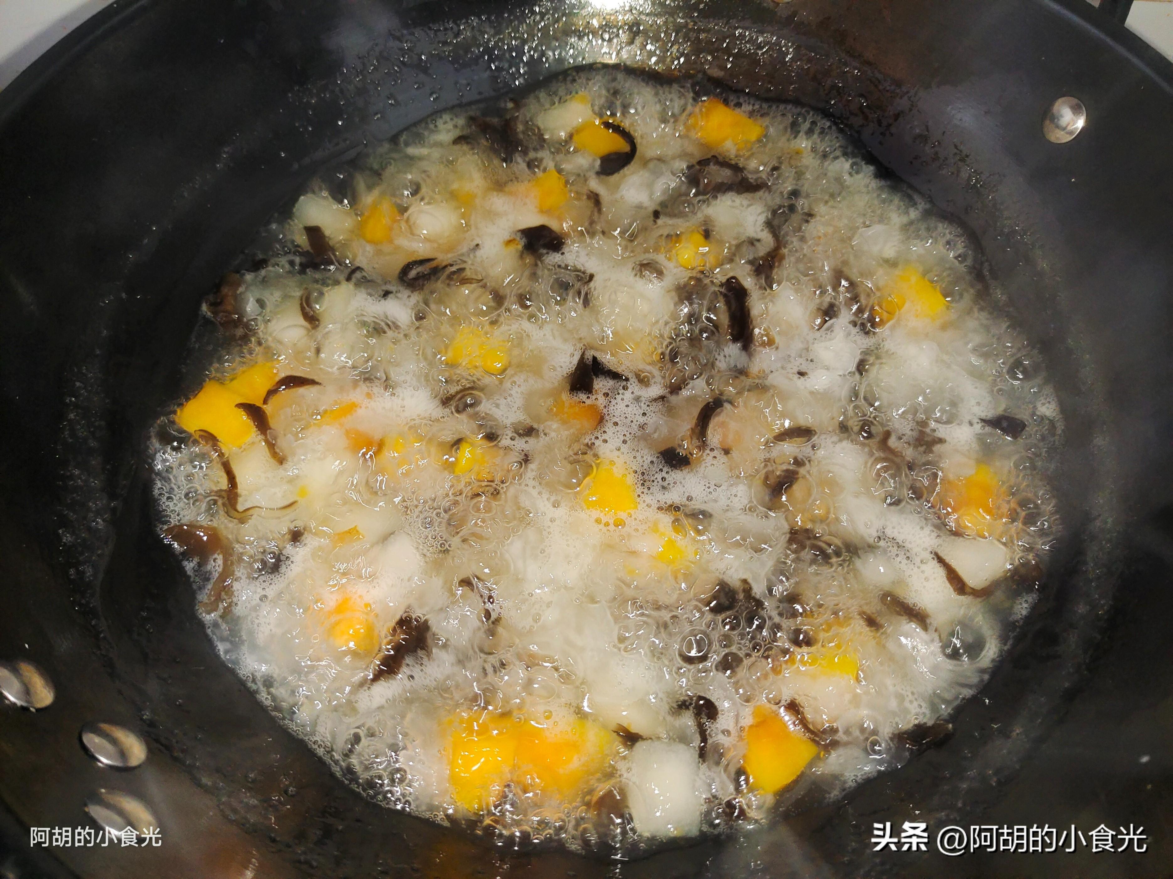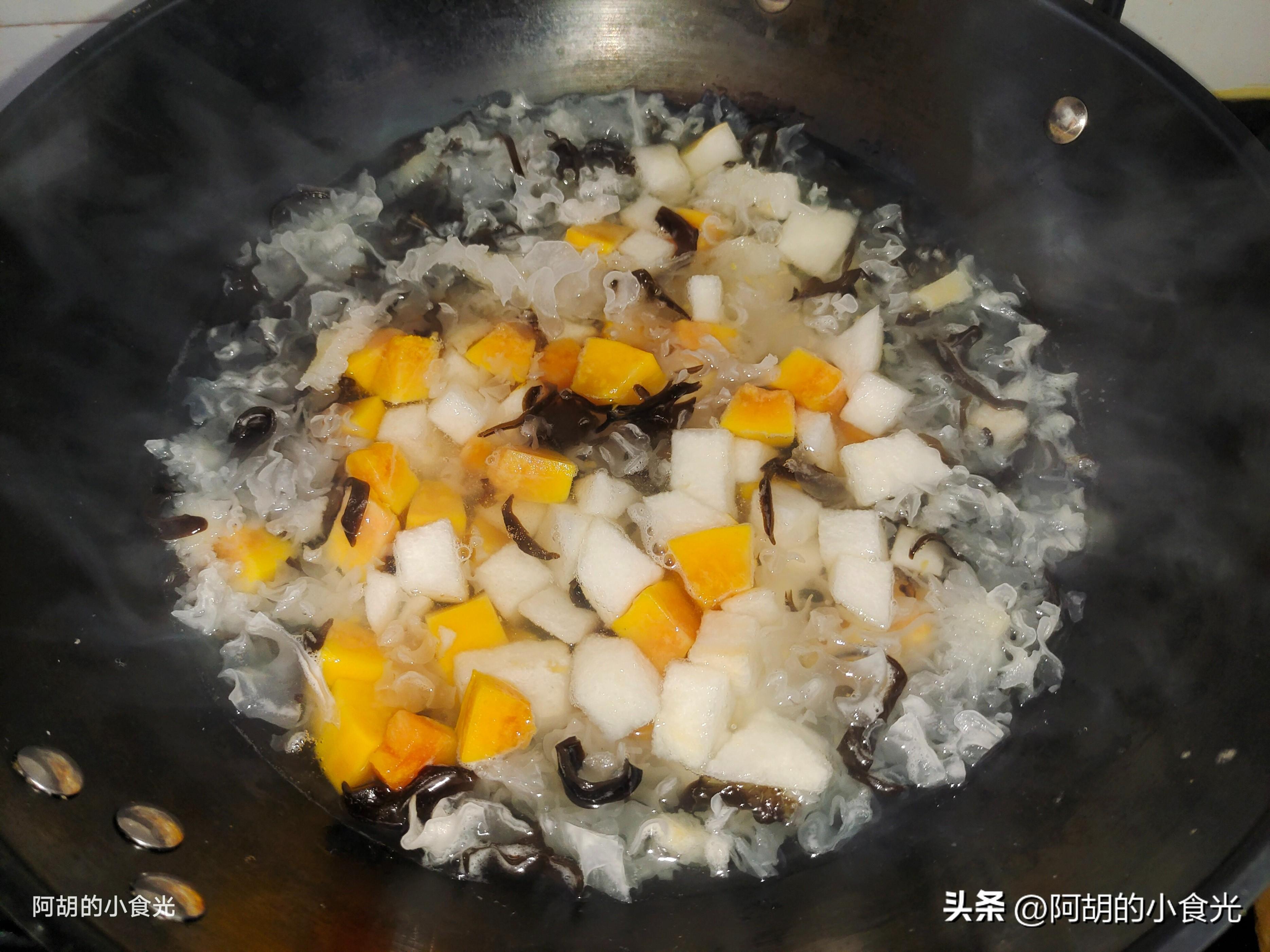 第三步:食材準備好後就可以開火烹飪了。先在鍋中添入一些涼水,而後把木耳絲和銀耳碎先丟入鍋中煮,開最大火將其煮開煮沸,而後把木瓜和梨子葉倒入鍋中,就這樣保持大火熬煮15分鐘左右。