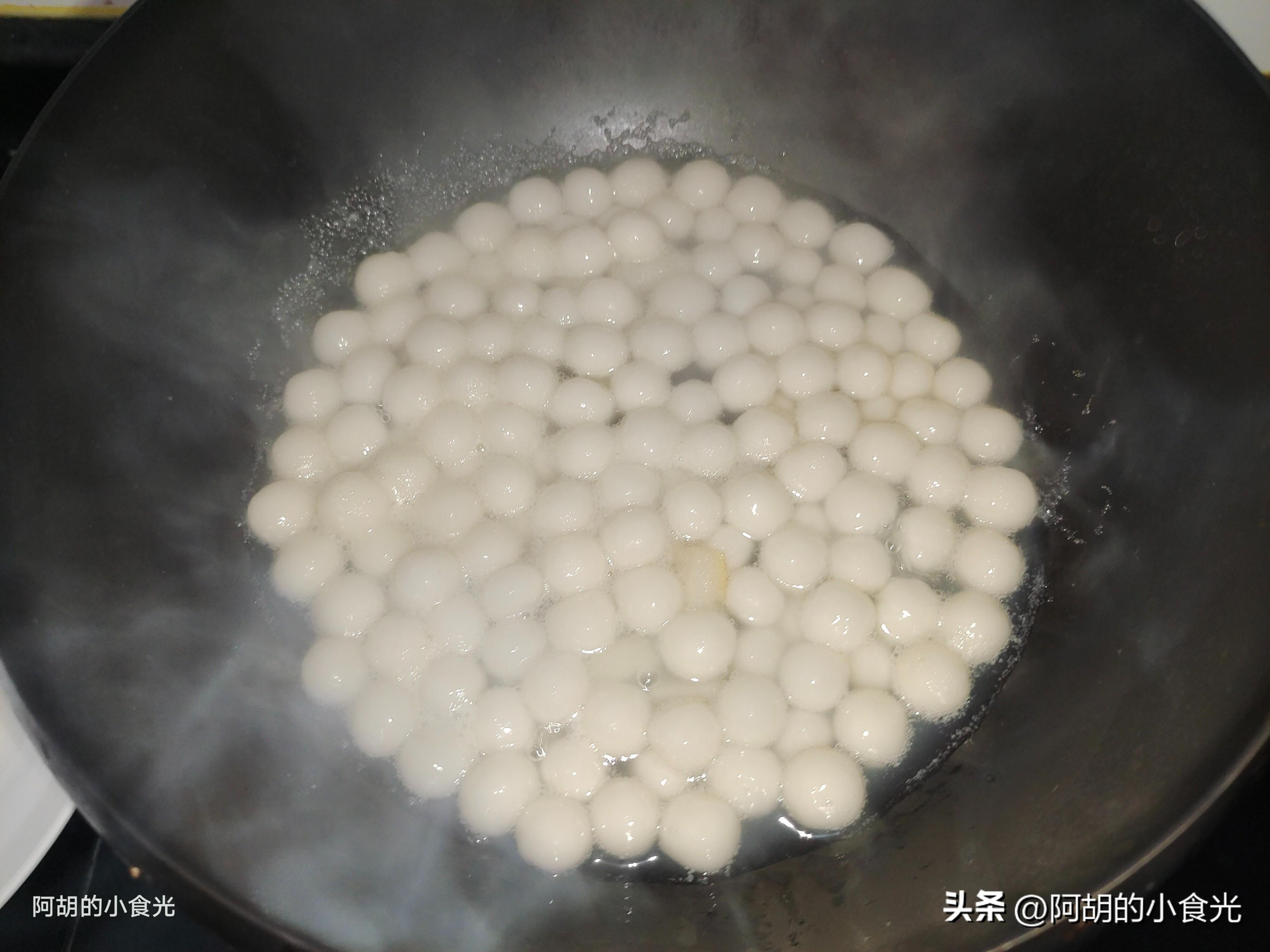 第五步:還有一個小湯圓還沒有下鍋,這裏建議另起一鍋燒一些開水,再把小湯圓下鍋煮至完全漂浮起來。把湯圓撈出後再倒入甜湯的鍋中攪拌均勻就可以出鍋了,如家中有幹桂花的也可以撒入一些點綴提味,特別鮮甜爽口又爽滑的一道甜湯,我想如果將其冷卻後再喝肯定更佳的開胃爽口,絕對是過年期間必備的一道解酒解膩湯品,感興趣的一定要試一試這個搭配做法。