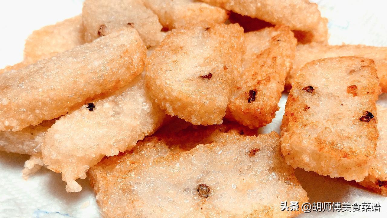 第三步:鍋中放入適量油,然後把年糕放入鍋中煎成兩面金黃撈出,接着撒上一點點白砂糖即可食用。