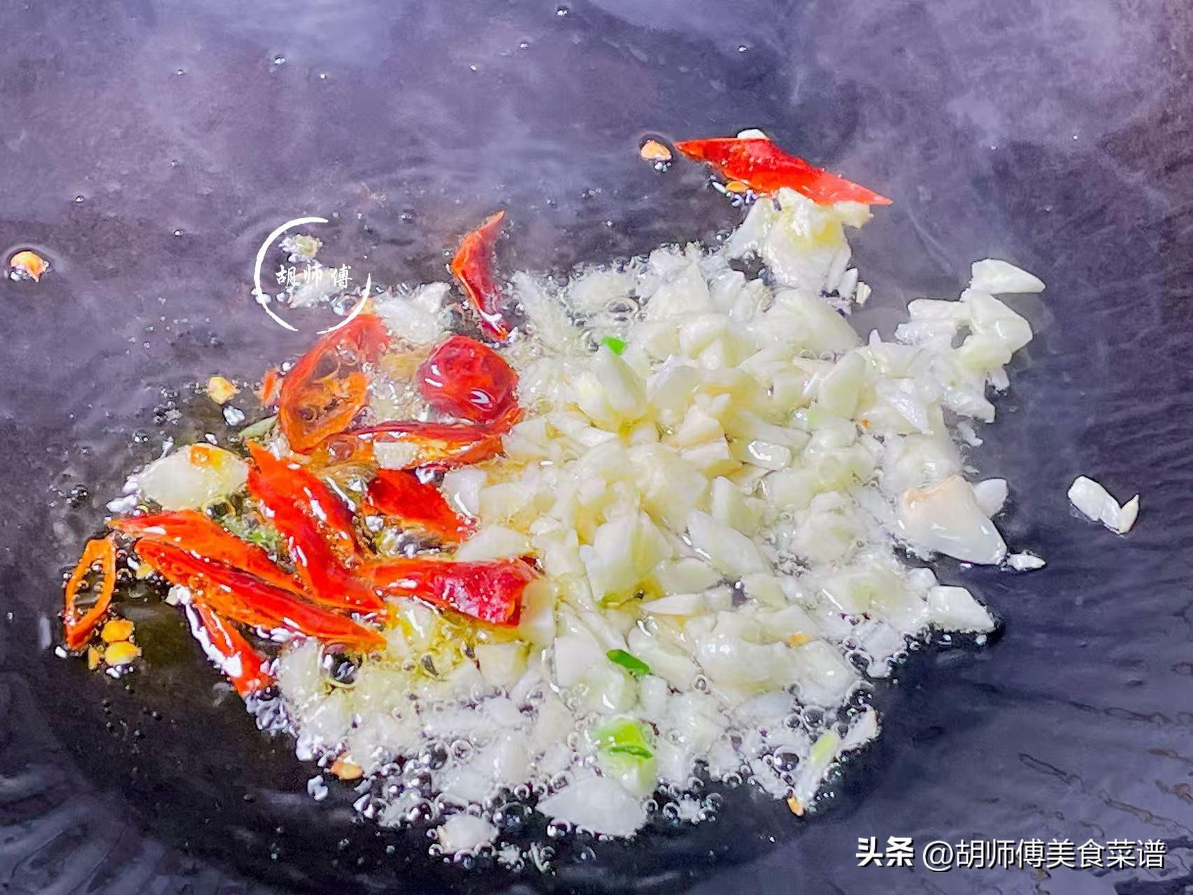 第三步:把鍋燒熱後,放入一勺豬油到鍋中,等油溫燒到6成熱後,將蒜末、幹辣椒放入鍋中爆香,然後再將枸杞芽放入鍋中,大火翻炒半分鐘左右,這樣可以徹底激發出枸杞芽的香味。