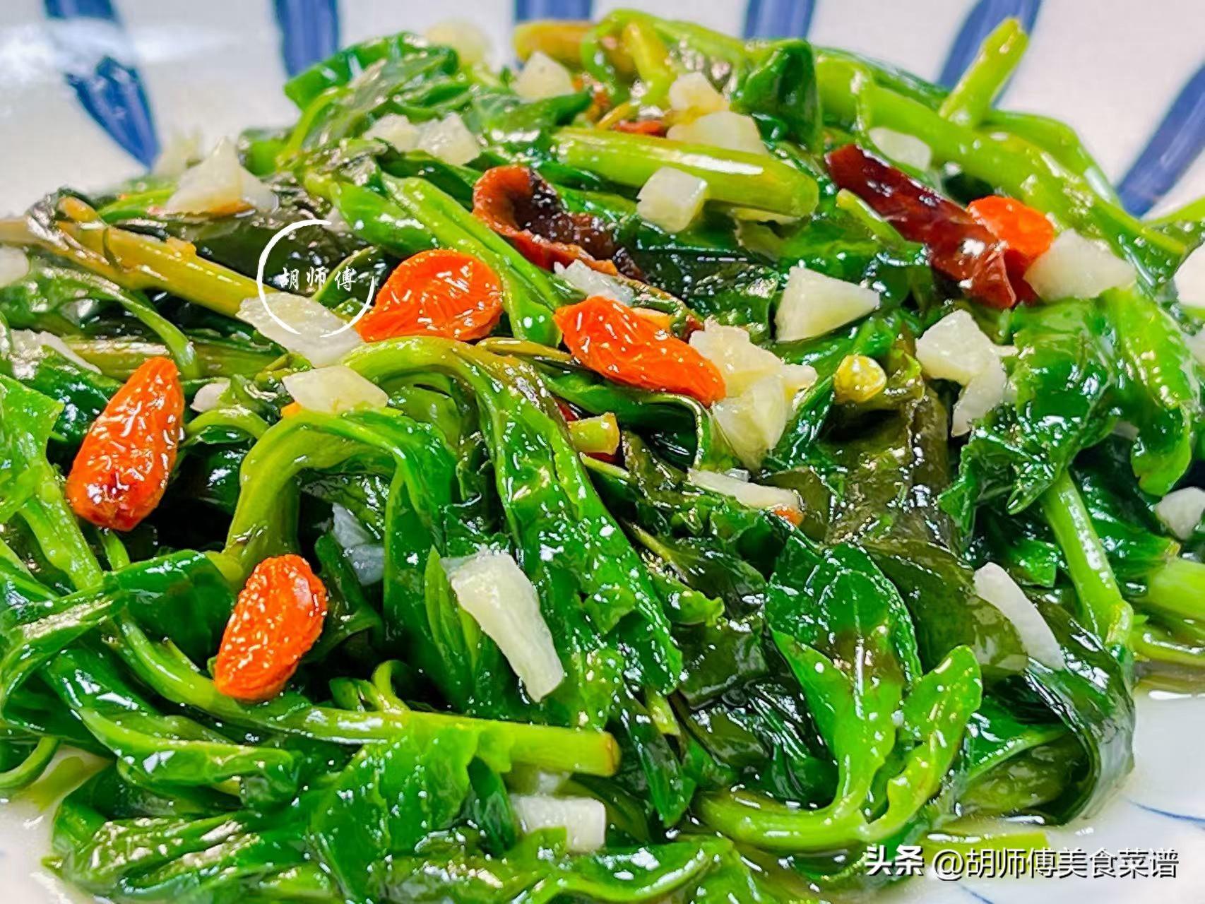 【食材準備】:枸杞芽350克、幹辣椒5克、枸杞3克、食鹽、蒜末、豬油、雞精適量。