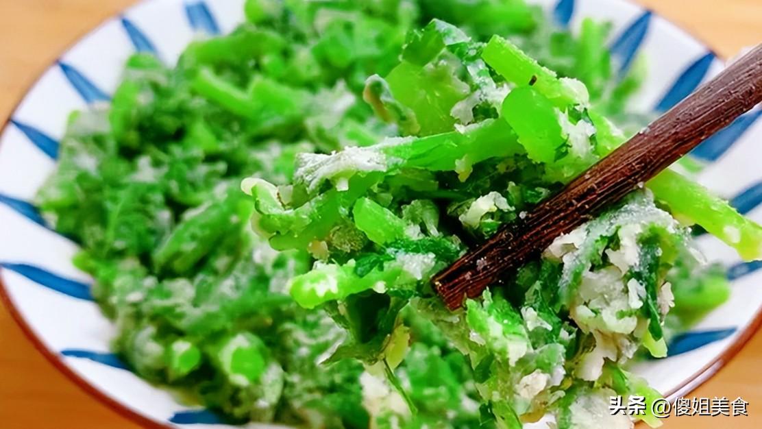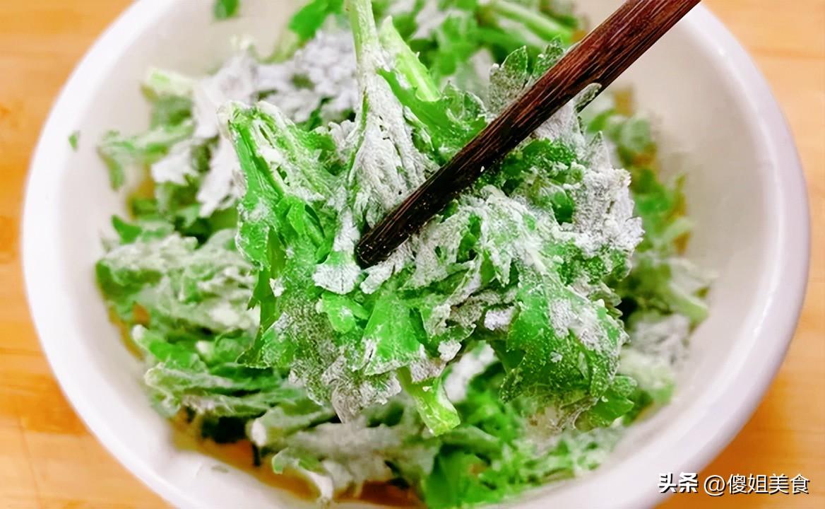 蒸好的茼蒿,綠意絲毫未減,反倒被熱氣逼得更鮮亮了,裹着的薄薄面粉,形成了一層軟糯微韌的外衣,鎖住了茼蒿本身的汁水和香氣。入口先是面的軟糯,輕輕一嚼,茼蒿獨特的清香瞬間迸發,帶着春天植物特有的鮮甜,口感層次分明,清爽又落胃。