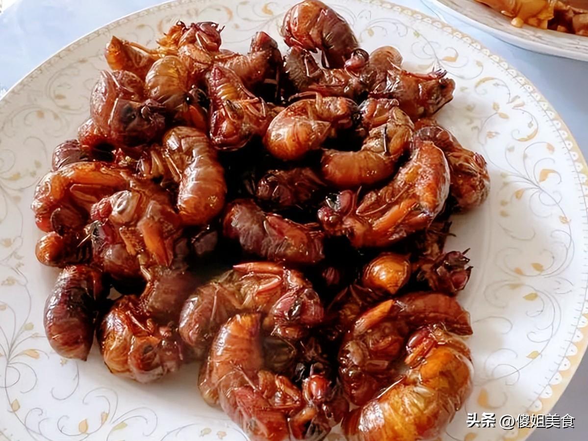如果說前面的菜還能勉強接受,那油炸金蟬,絕對是不少人的“心理陰影”。就像圖裏的這盤菜,炸得金黃酥脆的金蟬,在盤子裏堆成小山,看着就讓人頭皮發麻。