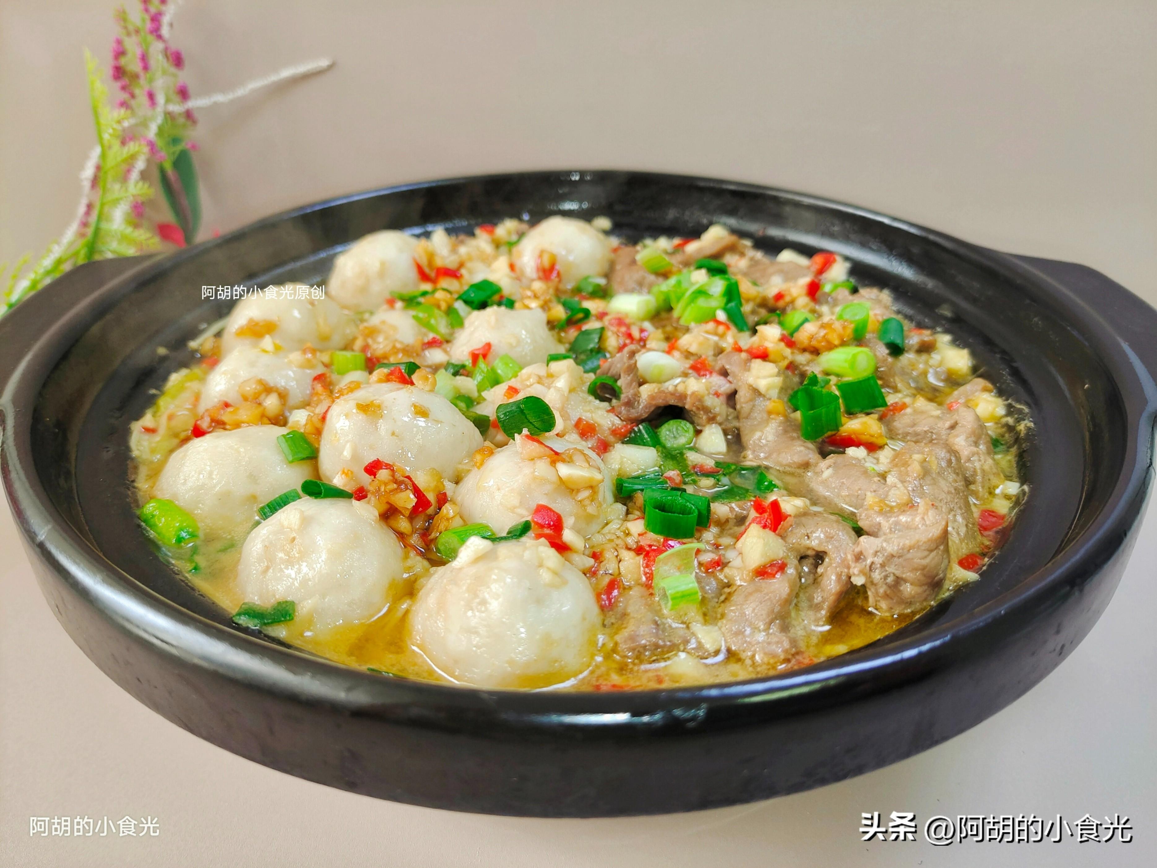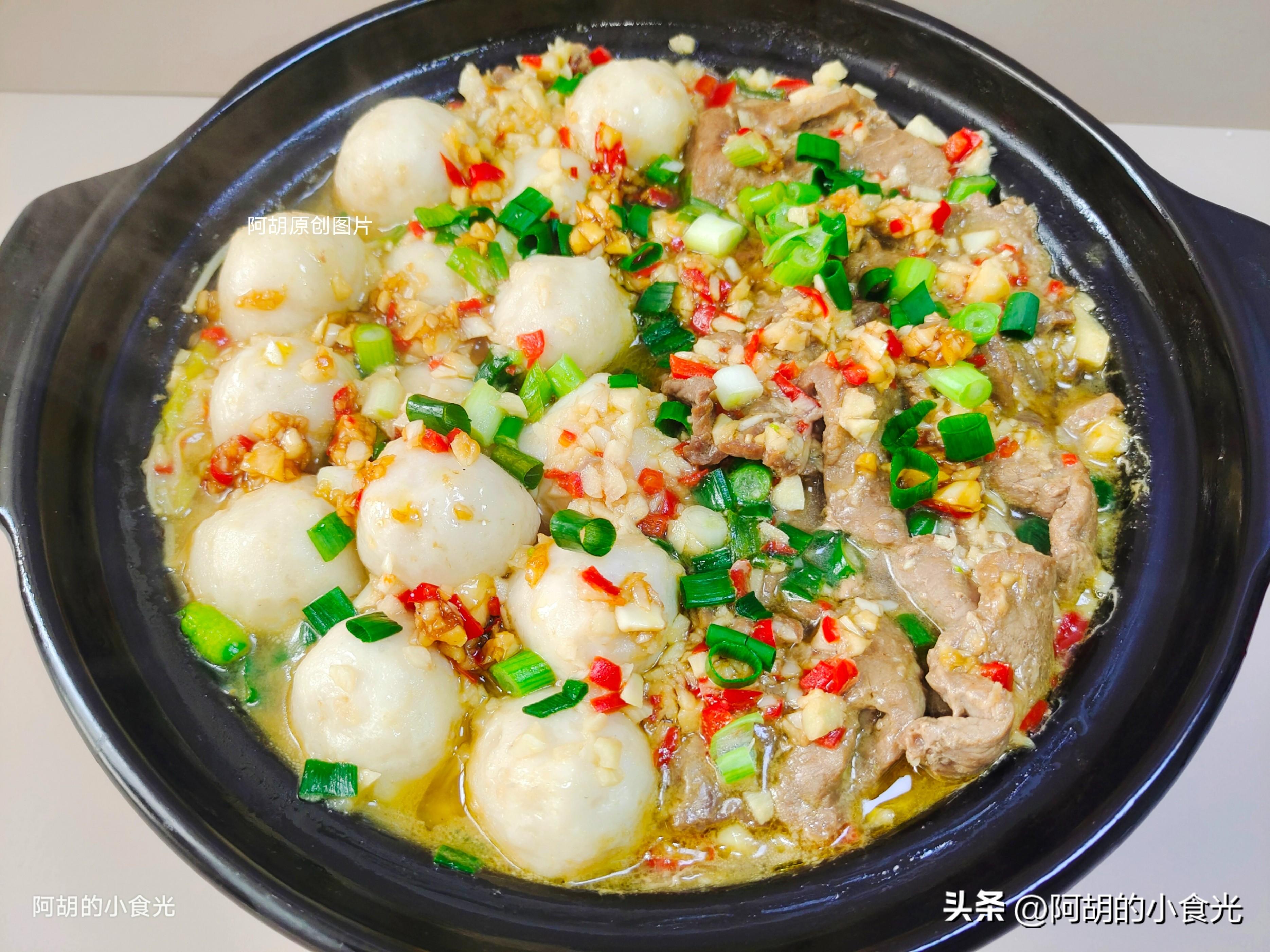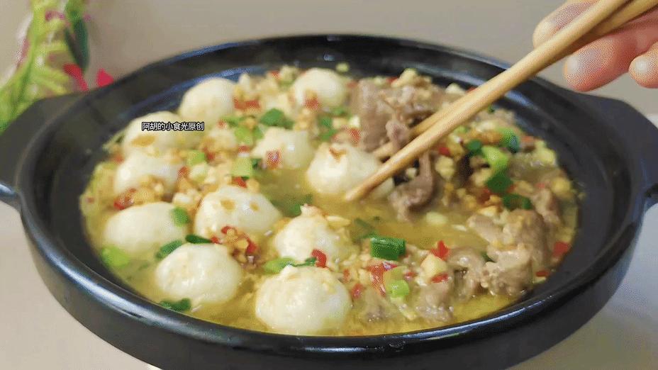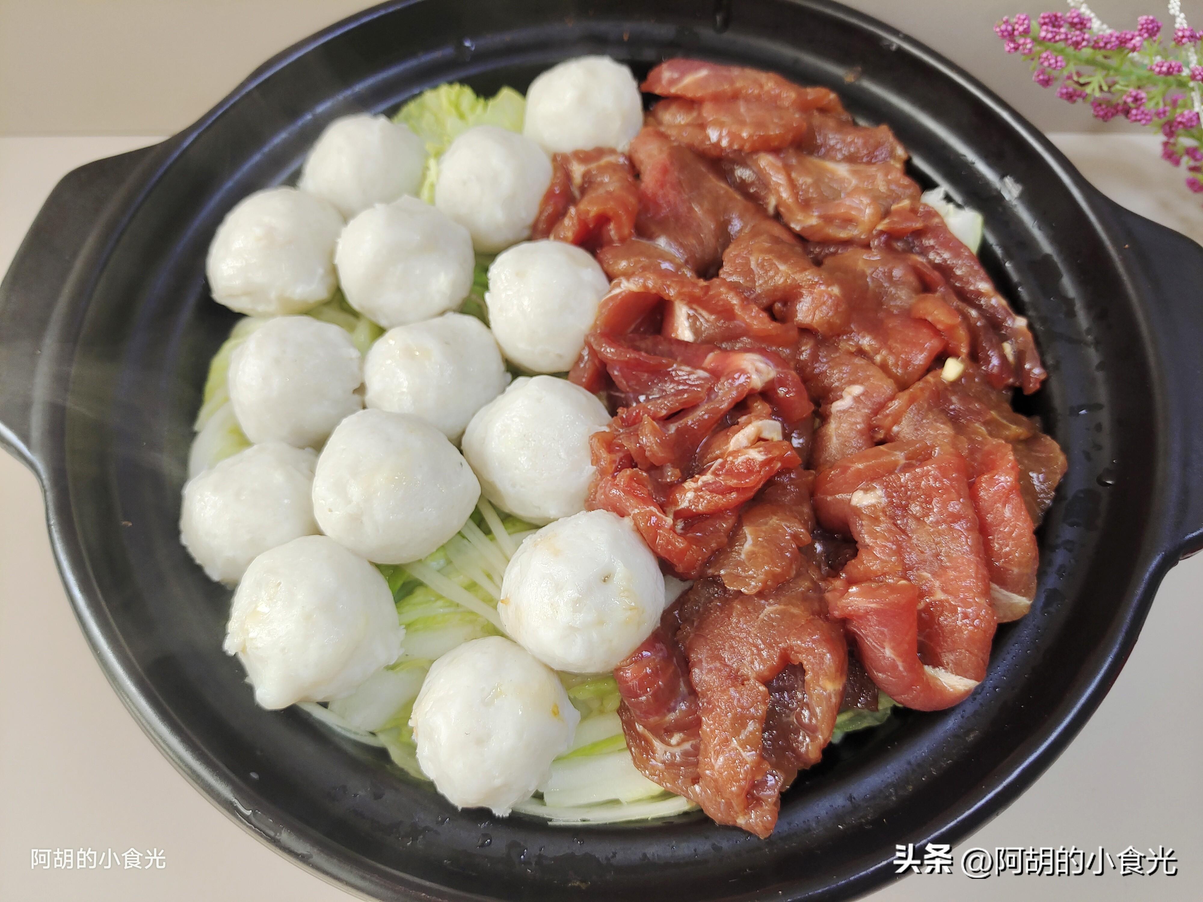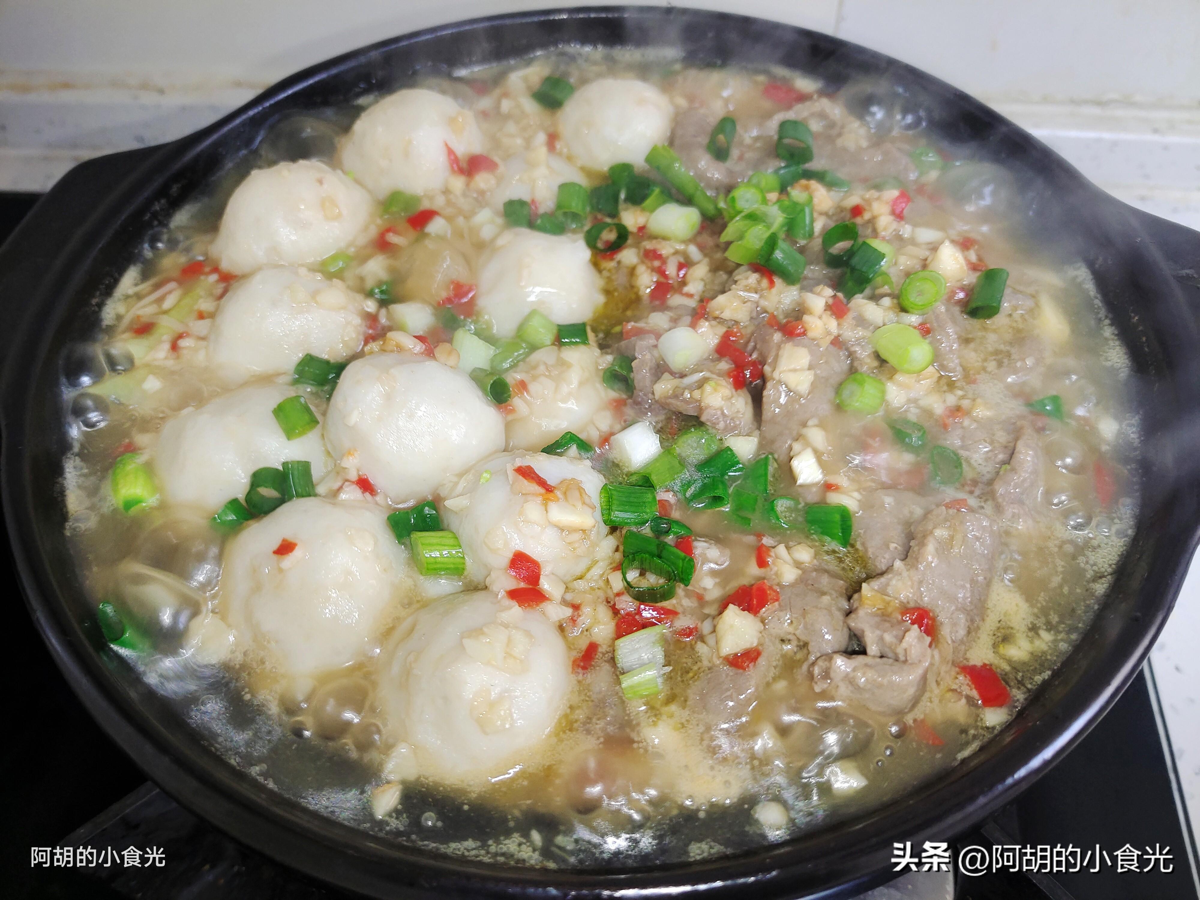 第五步:注意砂鍋要加蓋,開大火煮至沸騰後轉爲小火繼續燜煮10分鐘左右就可以關火了,最後撒入一把蔥花點綴提味就可以上桌開喫了。上桌後還在咕嘟咕嘟冒着熱氣,開蓋就是濃濃的蒜蓉味,令人食慾大增,魚丸脆嫩鮮香,牛肉鮮嫩適口,一鍋有菜有肉營養豐富,關鍵好喫還好做,值得試一試。