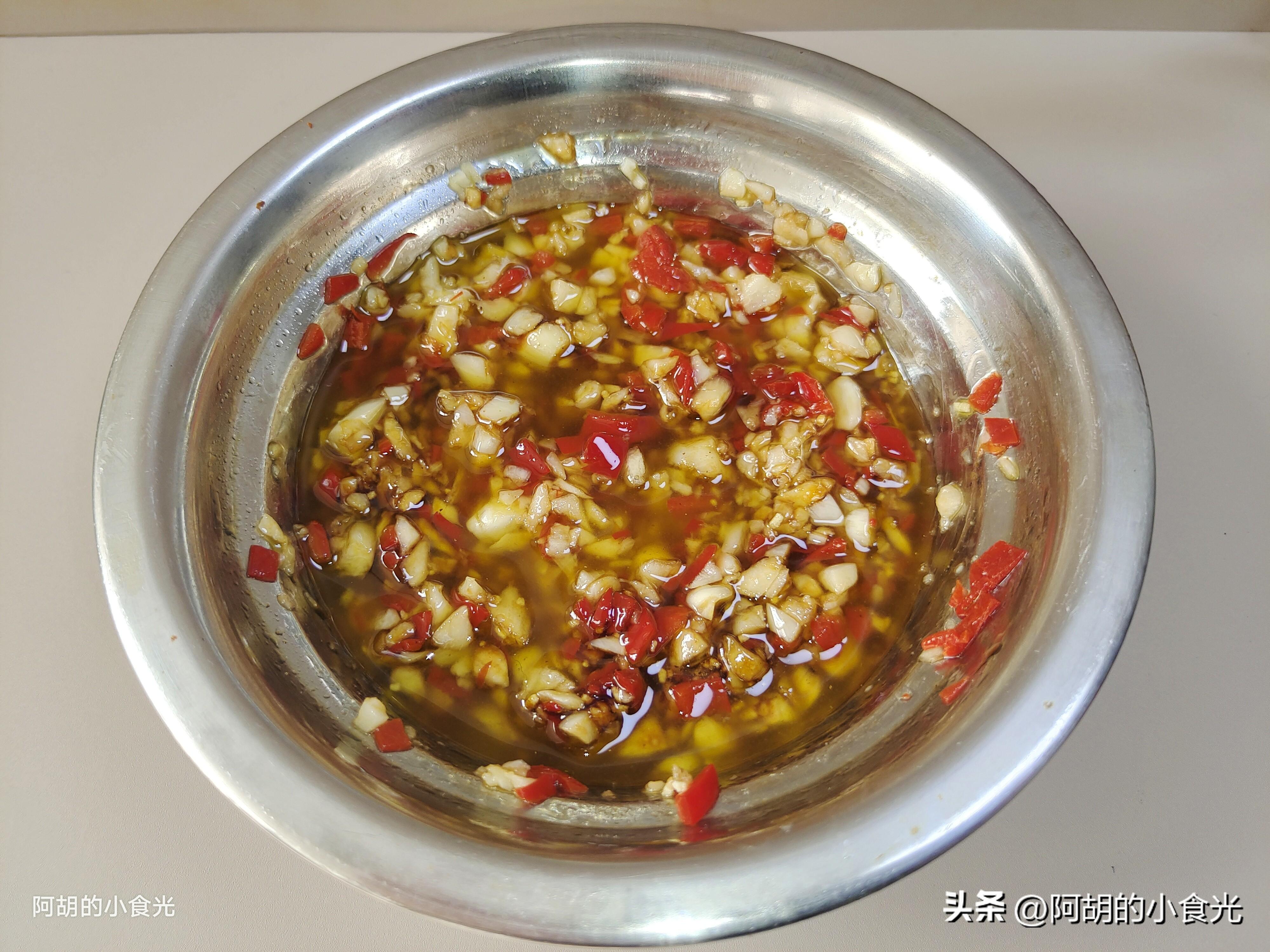 第二步:再來準備一個簡單的蒜蓉醬,兩頭大蒜去皮後剁碎成蒜末放入碗中,再搭配一些紅椒粒,喜歡辣味的可以用紅小米椒碎代替,而後把菜籽油燒熱至冒煙,趁熱把熱油倒入蒜末中激發出香味,再依次加入蠔油、生抽、少許白糖和食鹽攪拌均勻即可。