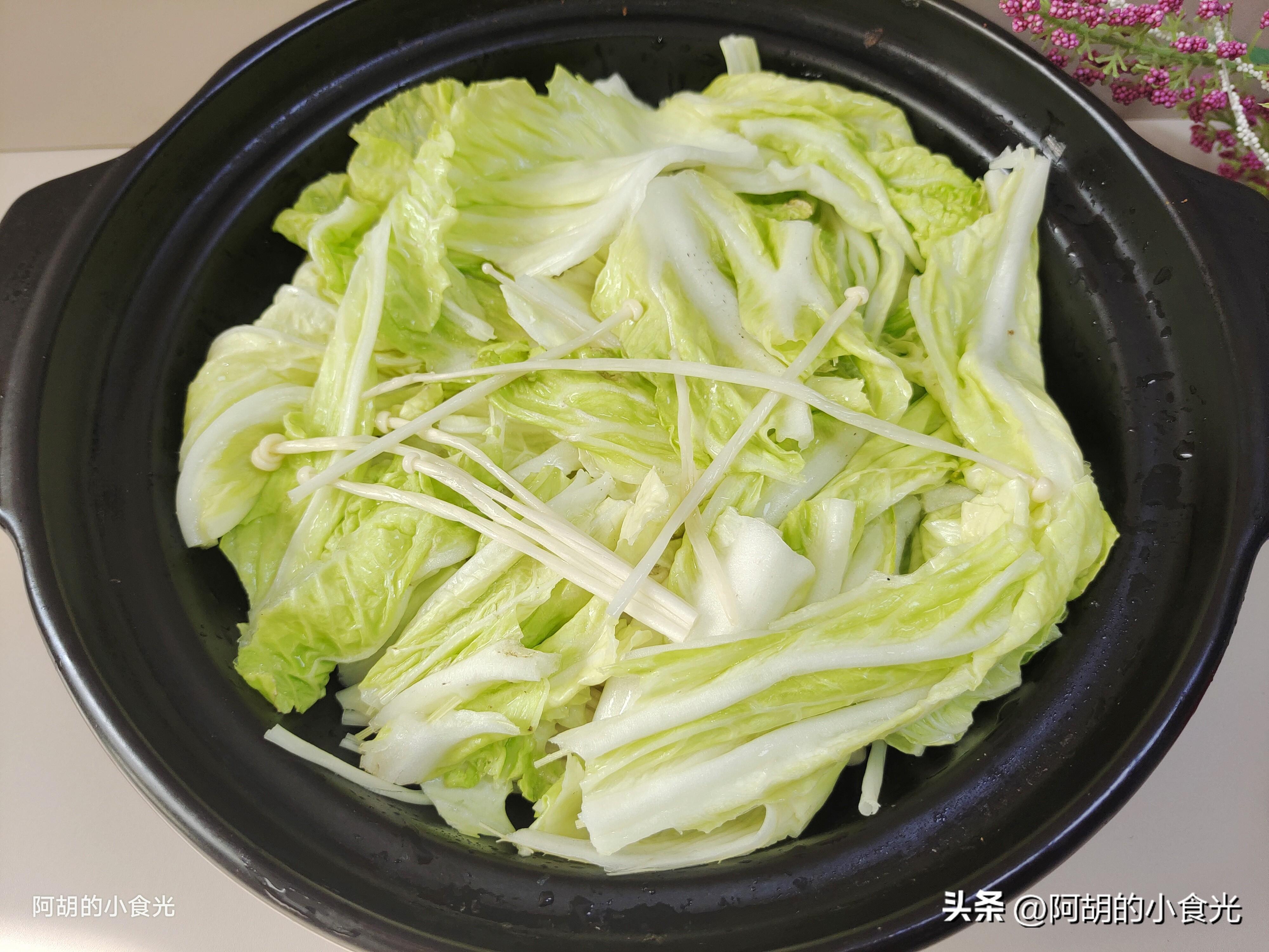第三步:其它的配菜又金針菇一把洗淨擠幹水分待用,一些白菜或者娃娃菜洗淨備用,喜歡的也可以再搭配一些龍口細粉,把這些配菜一塊鋪入砂鍋中待用,注意如果有粉絲的則不要墊底哦。