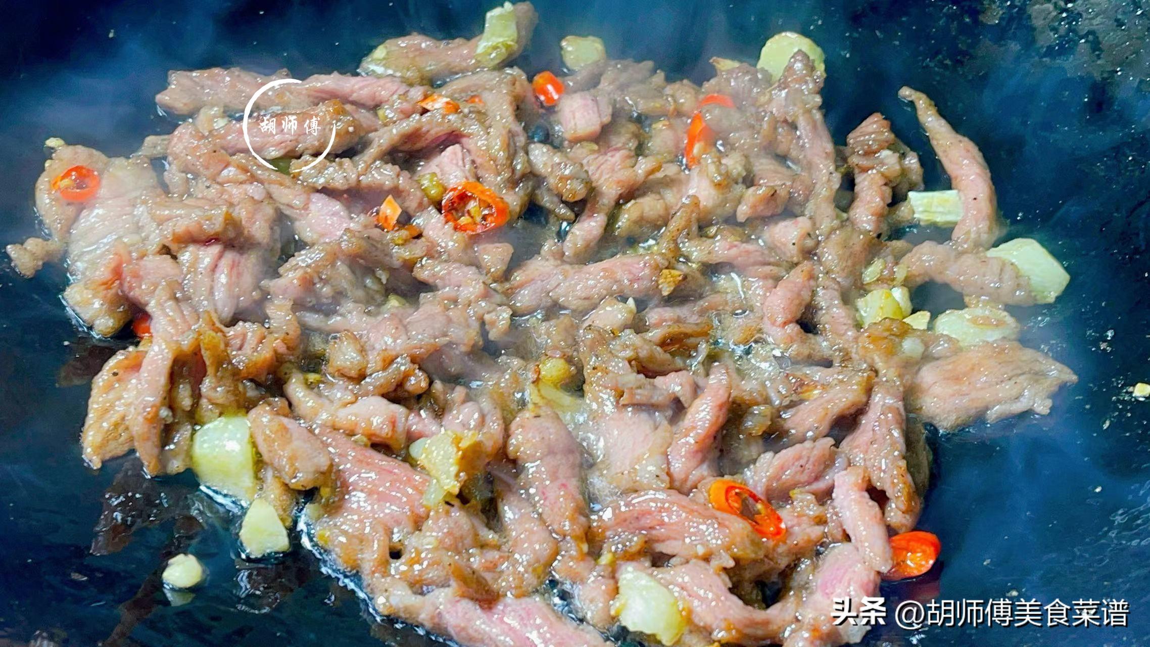 【食材準備】:野蔥150克、牛裏脊200克、生抽、蠔油、澱粉、食鹽、雞精、食用油、小米椒、薑末適量。