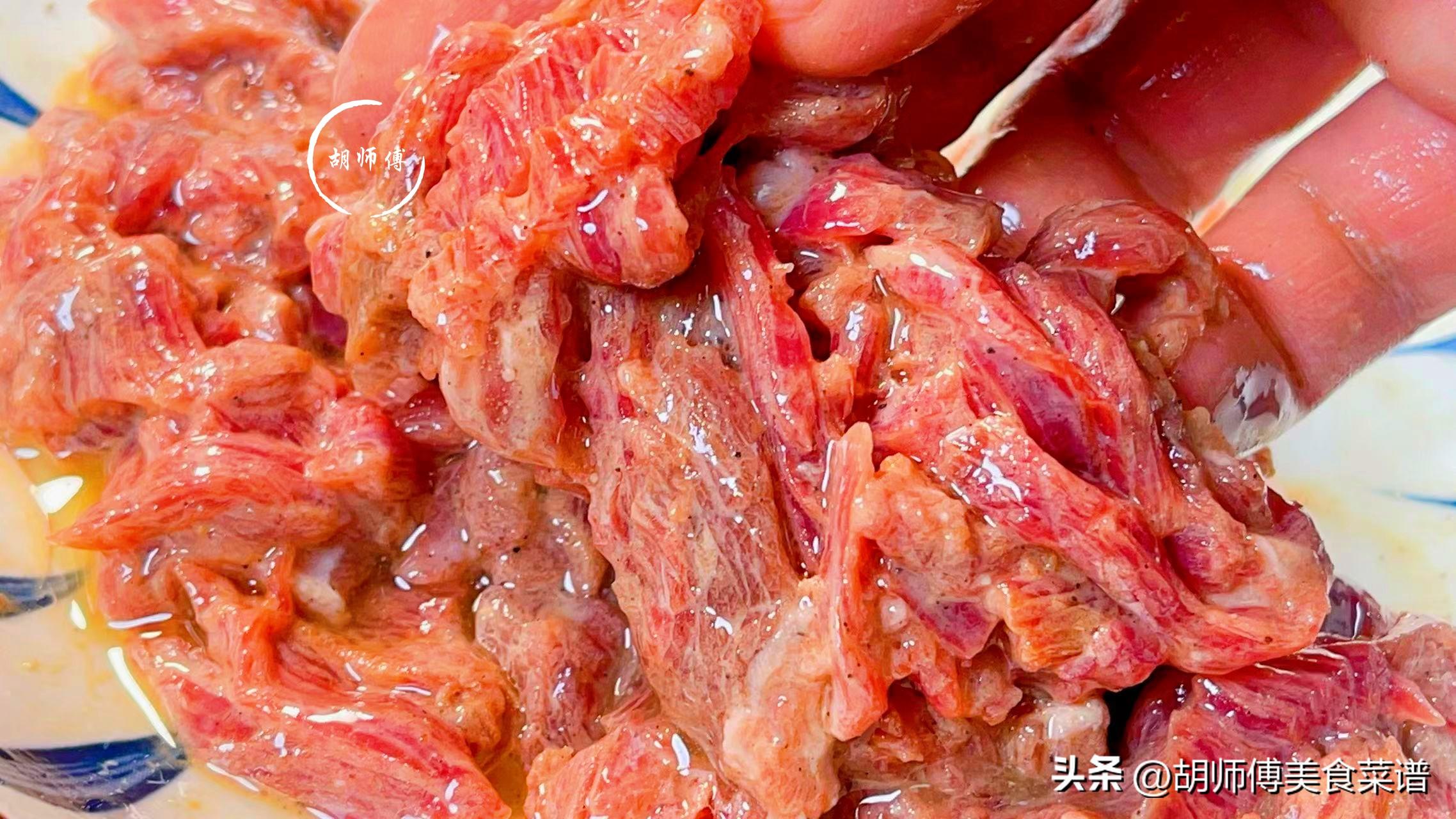 第一步:把牛裏脊洗淨後切成細絲,然後將生抽、蠔油、澱粉、薑末、食鹽、一勺油放入牛裏脊中,將它們攪拌均勻後醃製10分鐘即可備用。