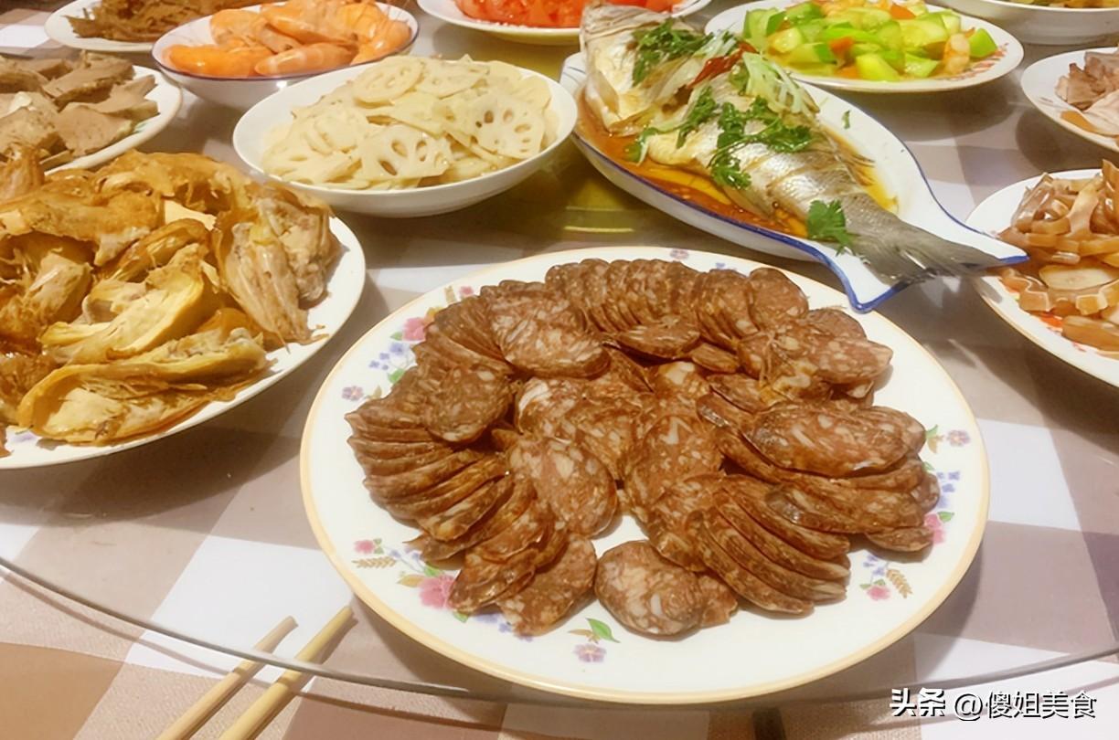 這一桌子菜,沒有昂貴的食材,沒有複雜的做法,全是最家常的味道。但正是這些家常菜,藏着最真的疼人之心。我媽知道女婿們愛喫肉,就多做了幾道硬菜;知道孩子們愛喫蝦,就特意蒸了大蝦;知道我們姊妹三個愛喫她曬的香腸,就提前一個月就開始準備。
