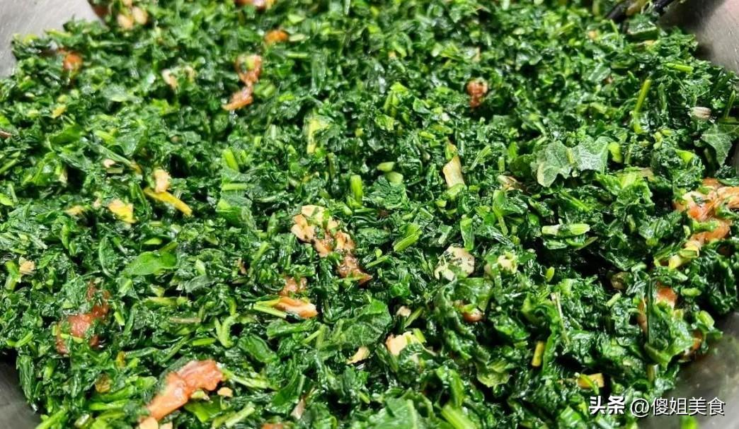 第四步:將切好的苦菜放入醃製好的肉餡中,再加入適量食用油(可以鎖住水分,使餡料更加鮮嫩),繼續順着同一個方向攪拌均勻。這樣,香氣撲鼻的苦菜肉餡就調好了。