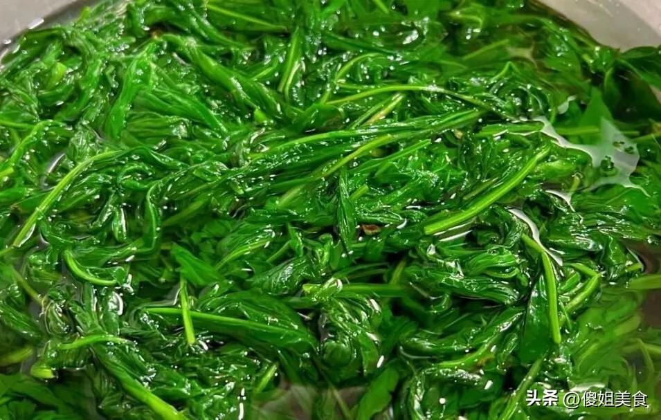 第二步:將苦菜摘洗乾淨,鍋中燒開水,加入少許鹽和幾滴食用油(這樣焯出來的苦菜顏色更綠),放入苦菜焯水1-2分鐘。撈出後立即放入涼水中過涼,這樣能保持苦菜的翠綠色和脆嫩口感。然後用手擠幹水分,這一步很重要,水分擠得越幹,包子的餡料越好包,也不容易破皮。擠幹水分的苦菜放到案板上切成碎末,備用。