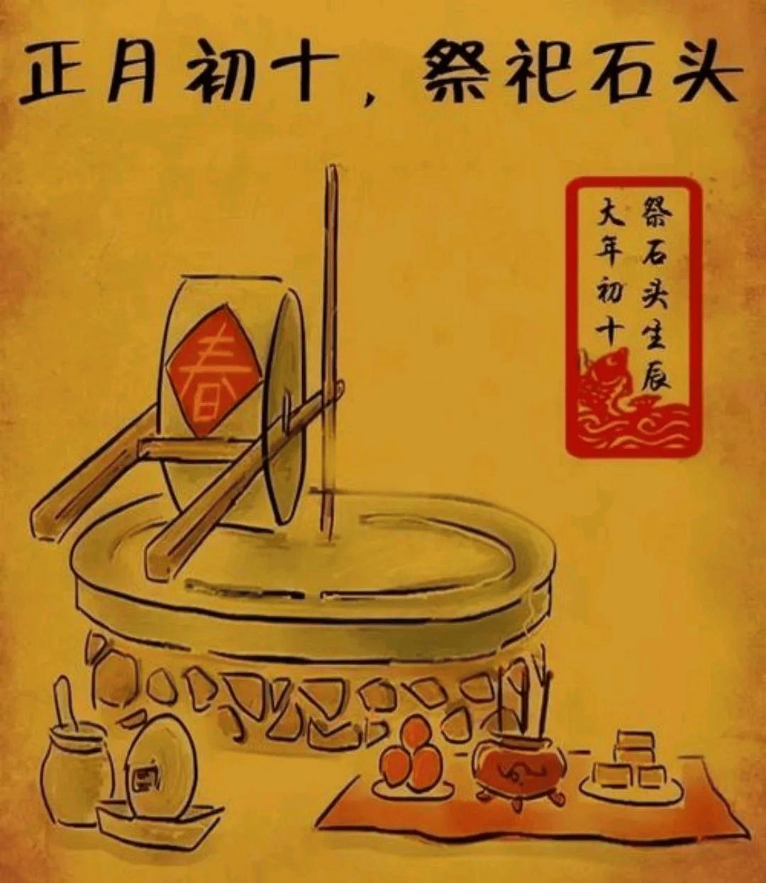 當然了,正月初十也叫石頭節,因爲石頭和土地緊密相連。在這一天,人們會格外敬重石頭,甚至連磨、碾等石制工具都要休息一天,不能使用。在一些農村地區,到了正月初十,大家會早早地把石磨、石碾用紅布蓋起來,就好像給它們穿上了漂亮的新衣服,讓它們也能好好過個節。這背後其實是人們對土地孕育萬物的一種感恩,石頭作爲土地的一部分,也跟着沾了光。