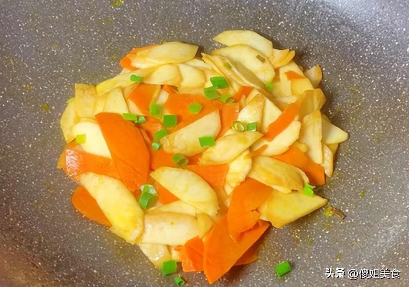 第四步:熱鍋冷油,油熱後放入蔥白部分爆香,然後倒入焯好水的茭白和胡蘿蔔,大火快速翻炒,讓食材均勻受熱。