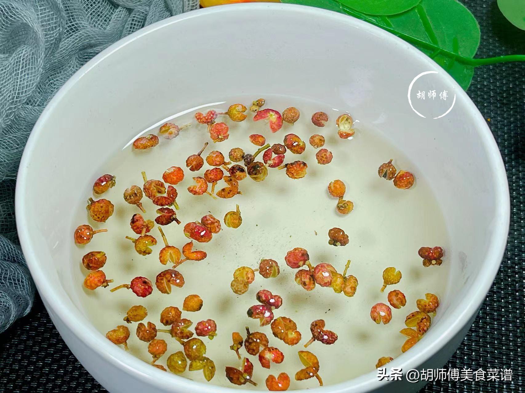 第三步:把花椒沖洗乾淨,然後把花椒和100ml熱水放入碗中,將花椒浸泡10分鐘,只留花椒水備用。