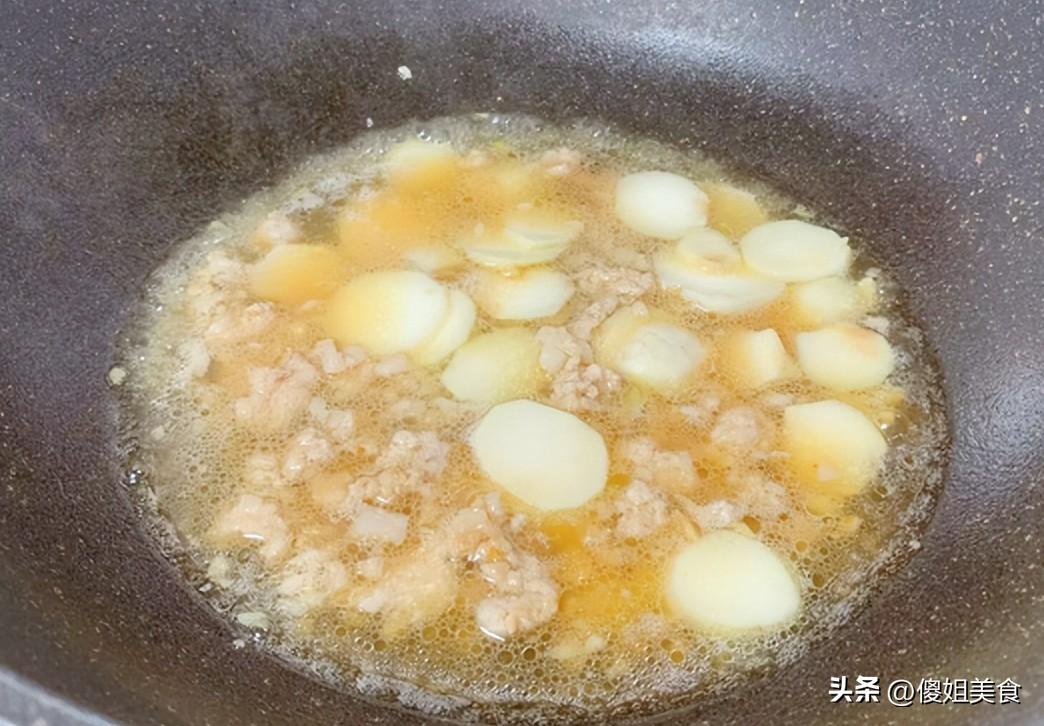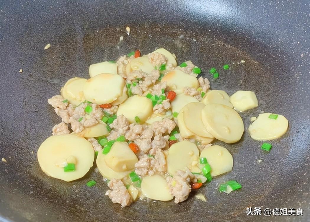 第三步:把切好的芋頭倒入鍋中,和肉末一起翻炒,這時候加入蒜末,蒜香和肉香混合在一起,聞着就流口水。再撒點香蔥和枸杞,炒到芋頭表面有點微微透明時,加入沒過食材一半的開水。