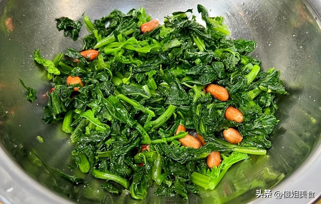 這裏有個關鍵:時間不能長,最多一分鐘,看着葉子變軟、顏色變深,馬上撈出來。時間長了,營養流失不說,口感也變得軟塌塌的,不好喫。撈出後立刻過涼水。最好是冰水,這樣能保持脆嫩的口感。熱蘿蔔纓子遇到冷水,瞬間鎖住鮮味,喫起來特別脆。