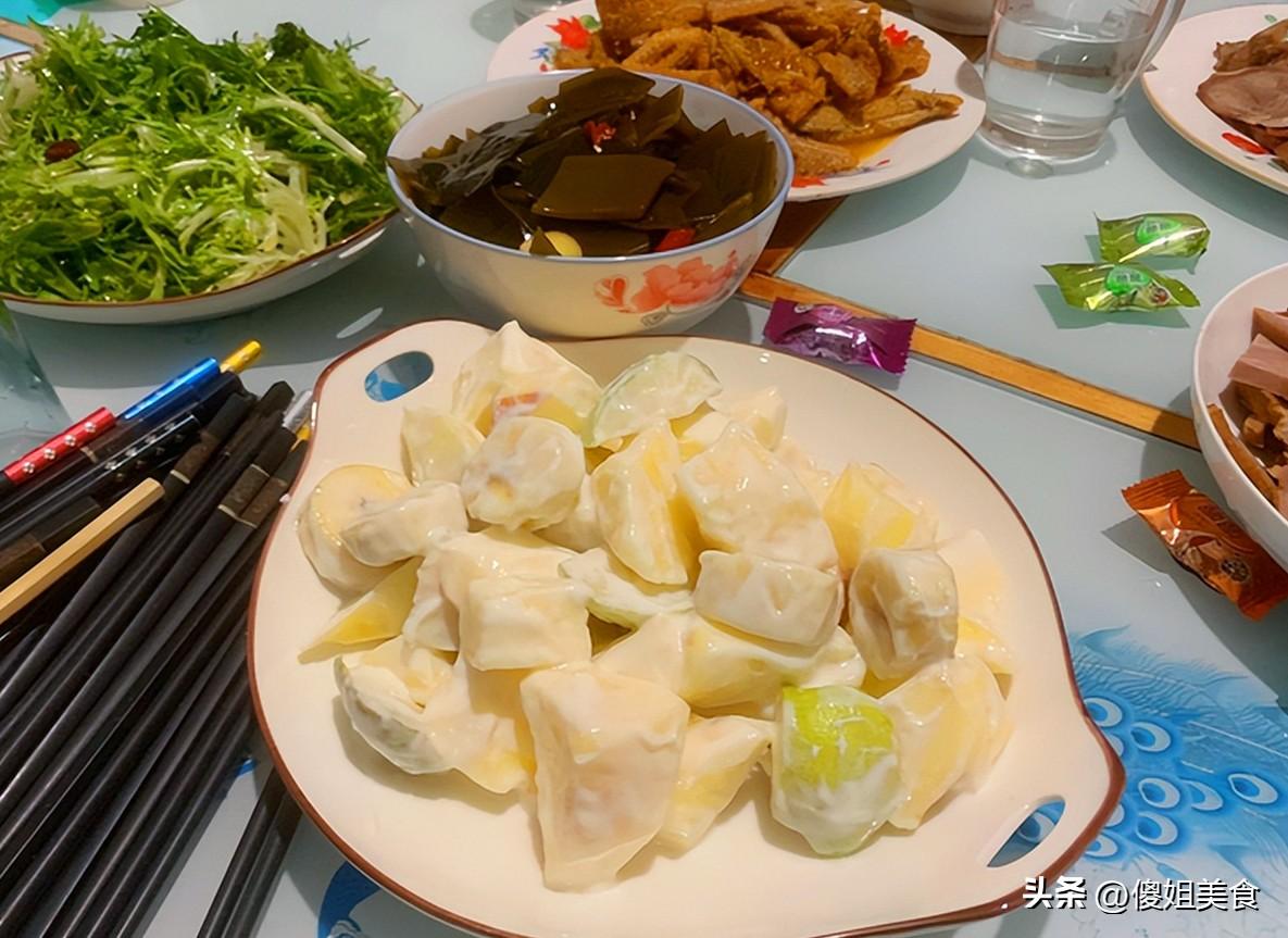 除了這幾道,桌上還有不少好東西:涼拌牛蹄筋Q彈勁道,滿滿的膠原蛋白;護心肉燉得爛乎乎的,是豬身上最嫩的地方;罐頭酥魚是弟媳婦提前炸好醃的,魚刺都酥透了,老人孩子都能放心喫;醃胡蘿蔔條、海帶片,酸甜開胃,那是俺們龍口老家過年必做的小鹹菜;水果沙拉用外地的酸奶拌的,裏頭有蘋果、香蕉、草莓,孩子搶着喫。