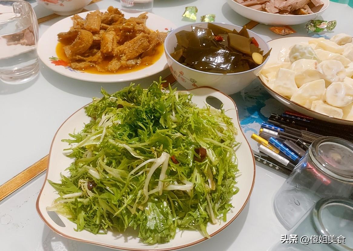 1. 涼拌苦菊:過年頓頓肉,嘴裏都發膩,弟媳婦頭一個就端上了涼拌苦菊。這菜在俺們龍口,過年桌上準能見到,簡單又頂用。先把新鮮苦菊摘乾淨,用涼白開泡上10分鐘,這樣喫起來格外脆。調個汁兒,兩勺生抽、一勺香醋、一勺香油,少擱點鹽和糖,再拍上兩瓣蒜剁成末。苦菊瀝乾水往盤子裏一碼,料汁一澆,蒜末一撒,齊活!