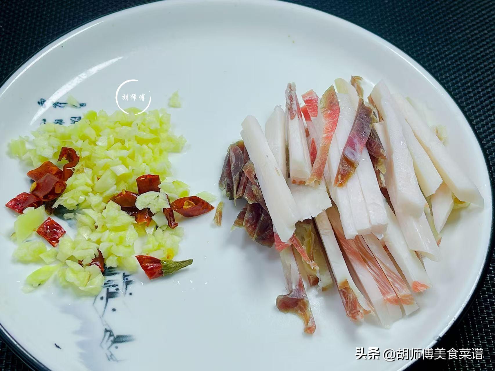 第二步:將臘肉洗淨後切成細絲,然後把蒜籽、老薑、幹辣椒都沖洗乾淨,接着再把蒜籽、老薑切成末,把幹辣椒剪成小段備用。
