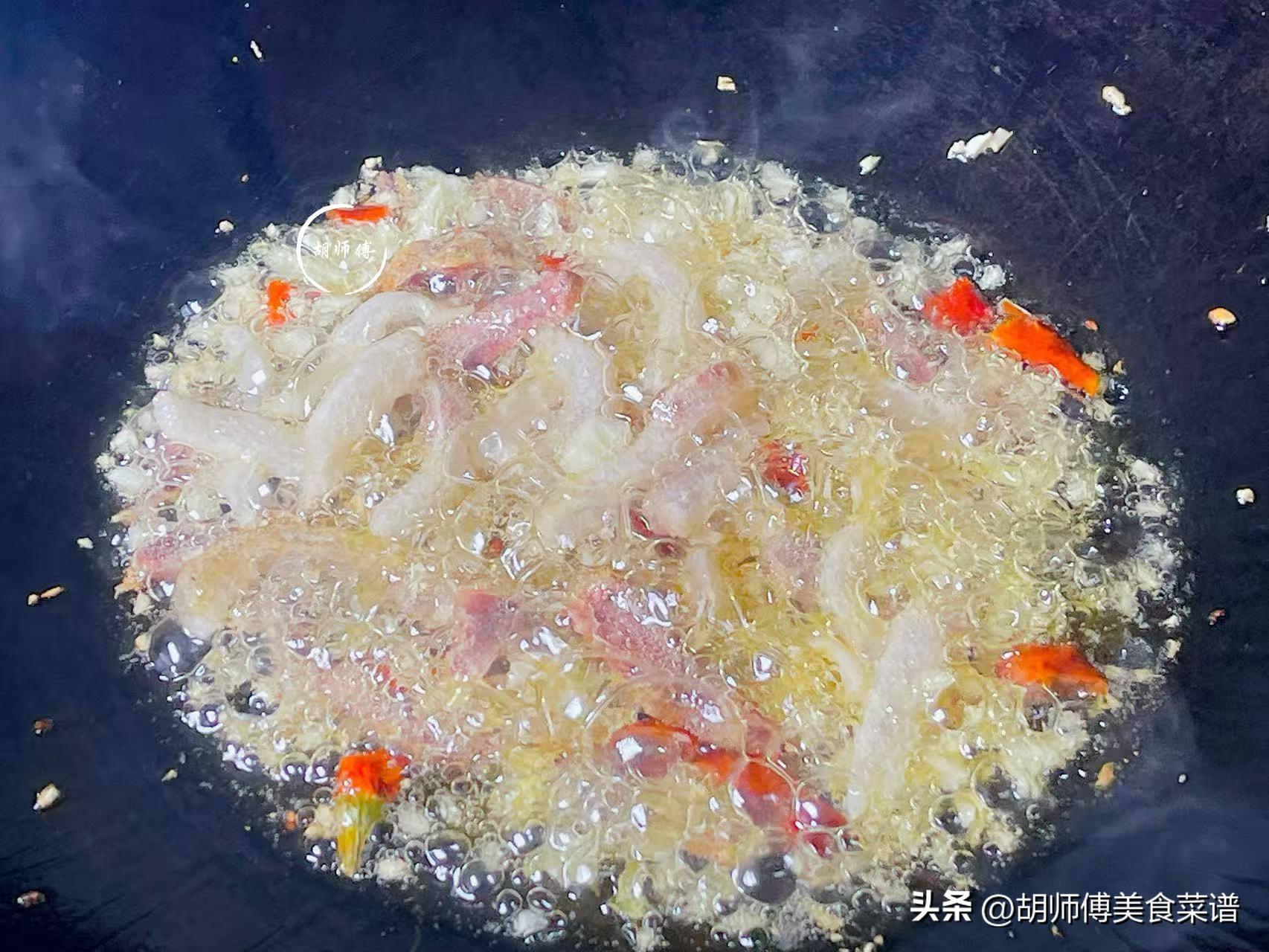 第四步:將鍋燒熱後,放入一勺油到鍋中,然後把臘肉絲放入鍋中煸炒香後,接着再把蒜末、薑末、幹辣椒放入鍋中爆香3秒。