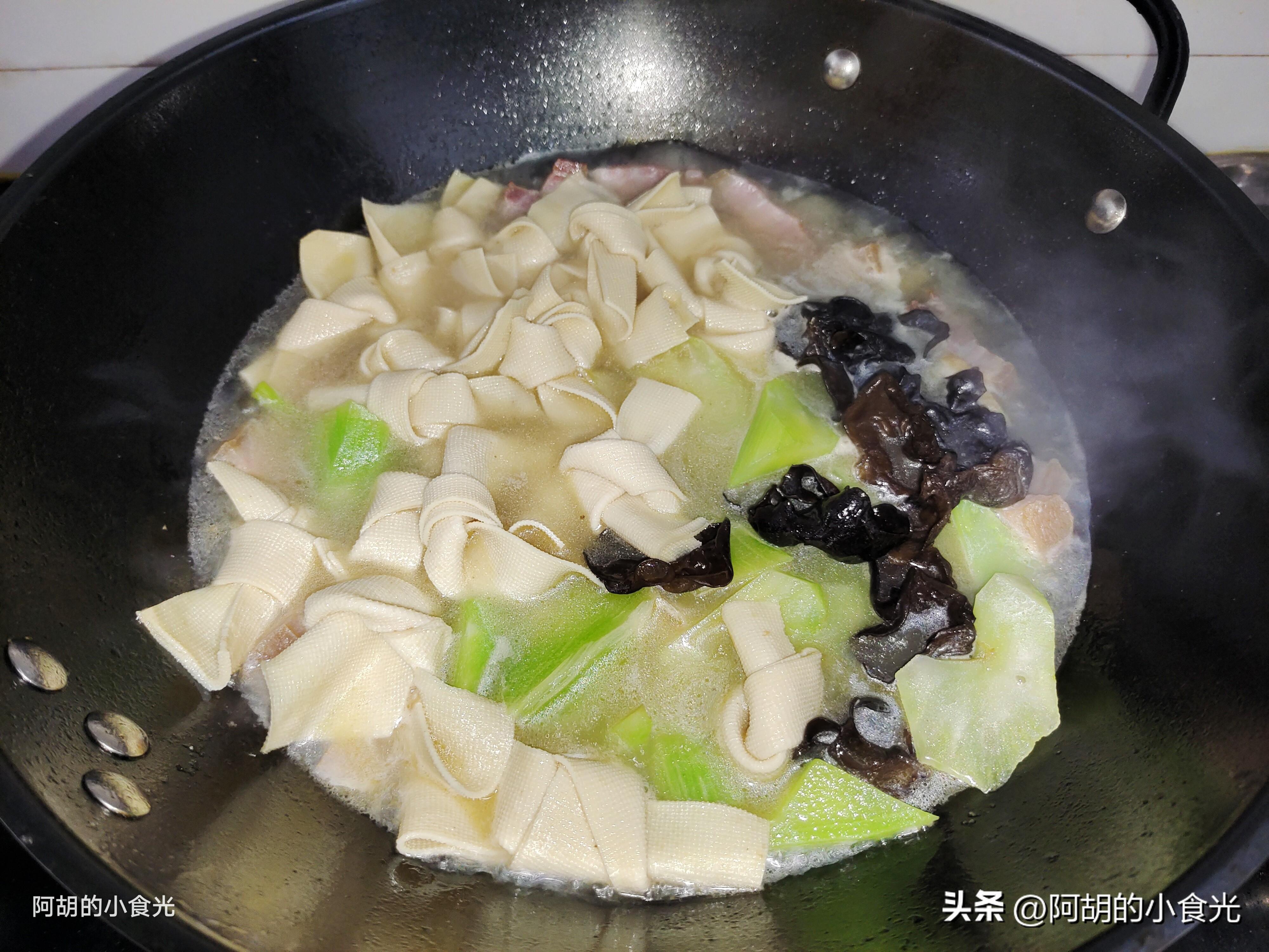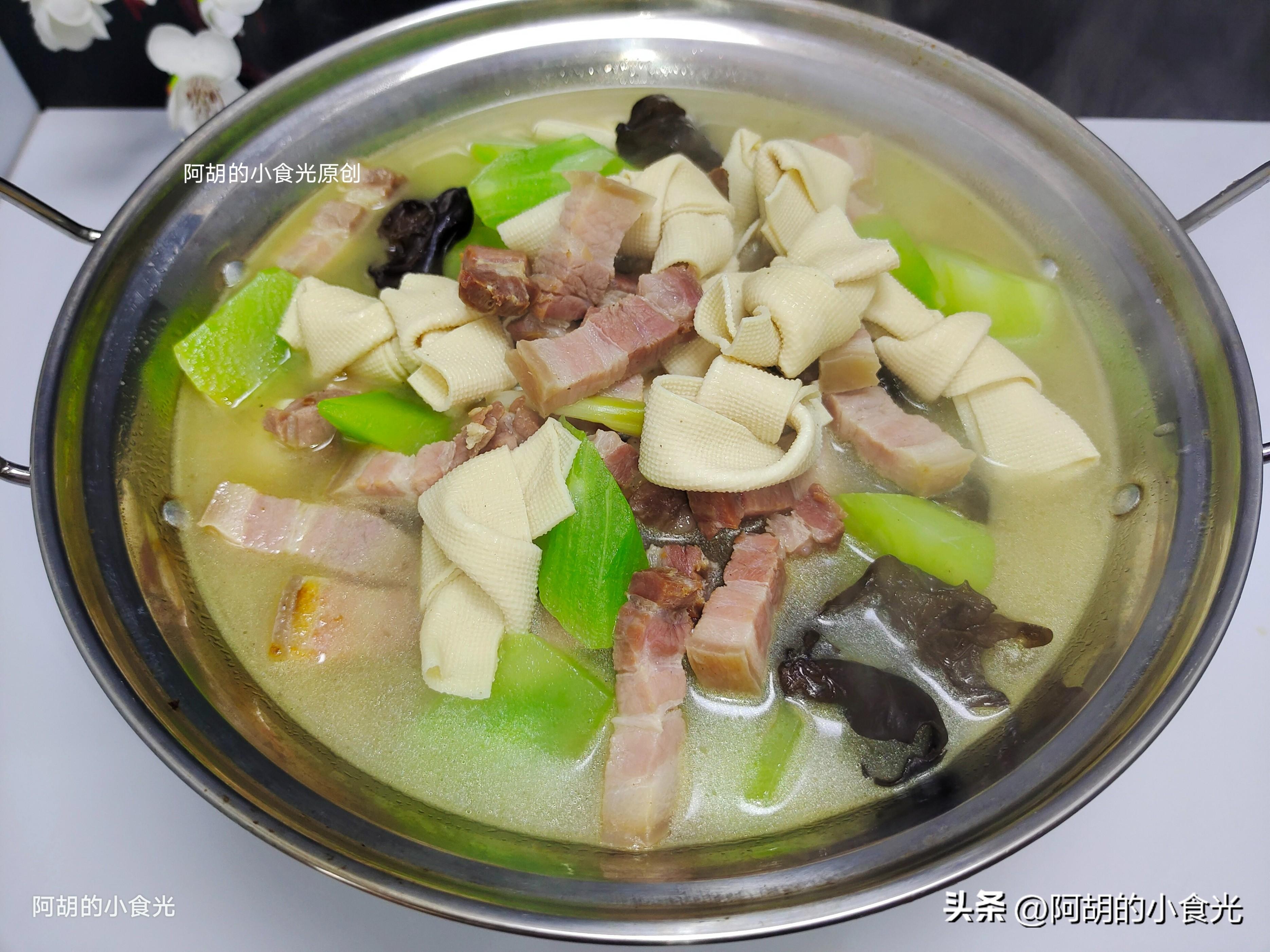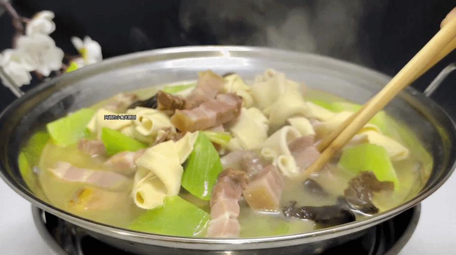 第四步:轉爲最大火煮一煮,讓湯汁呈現一些白色。而後把千張結、木耳和萵筍一塊倒入湯汁中,就這樣保持大火加蓋燉煮10分鐘左右,讓鹹肉的鹹香和各食材的鮮味充分地釋放出來。