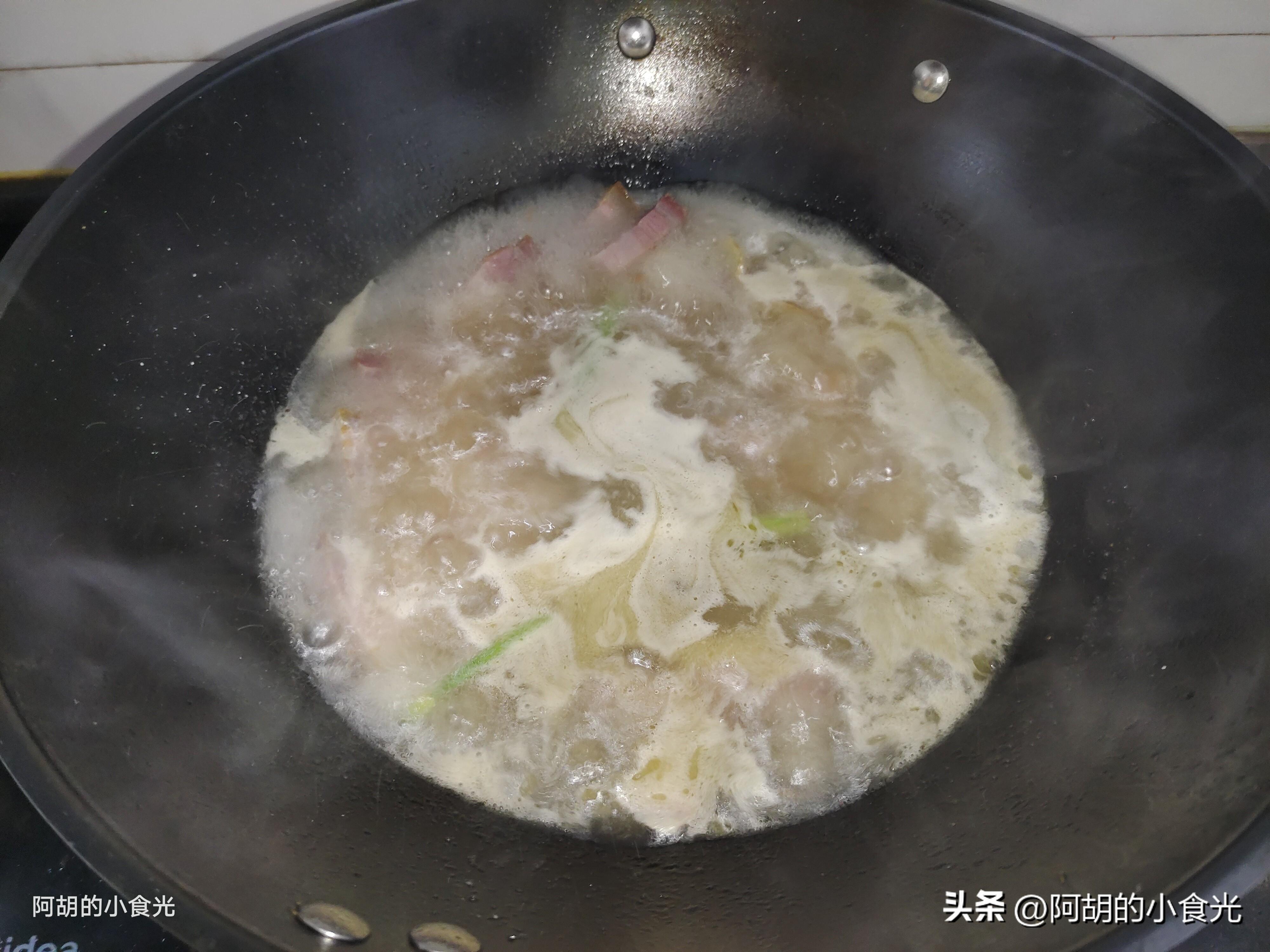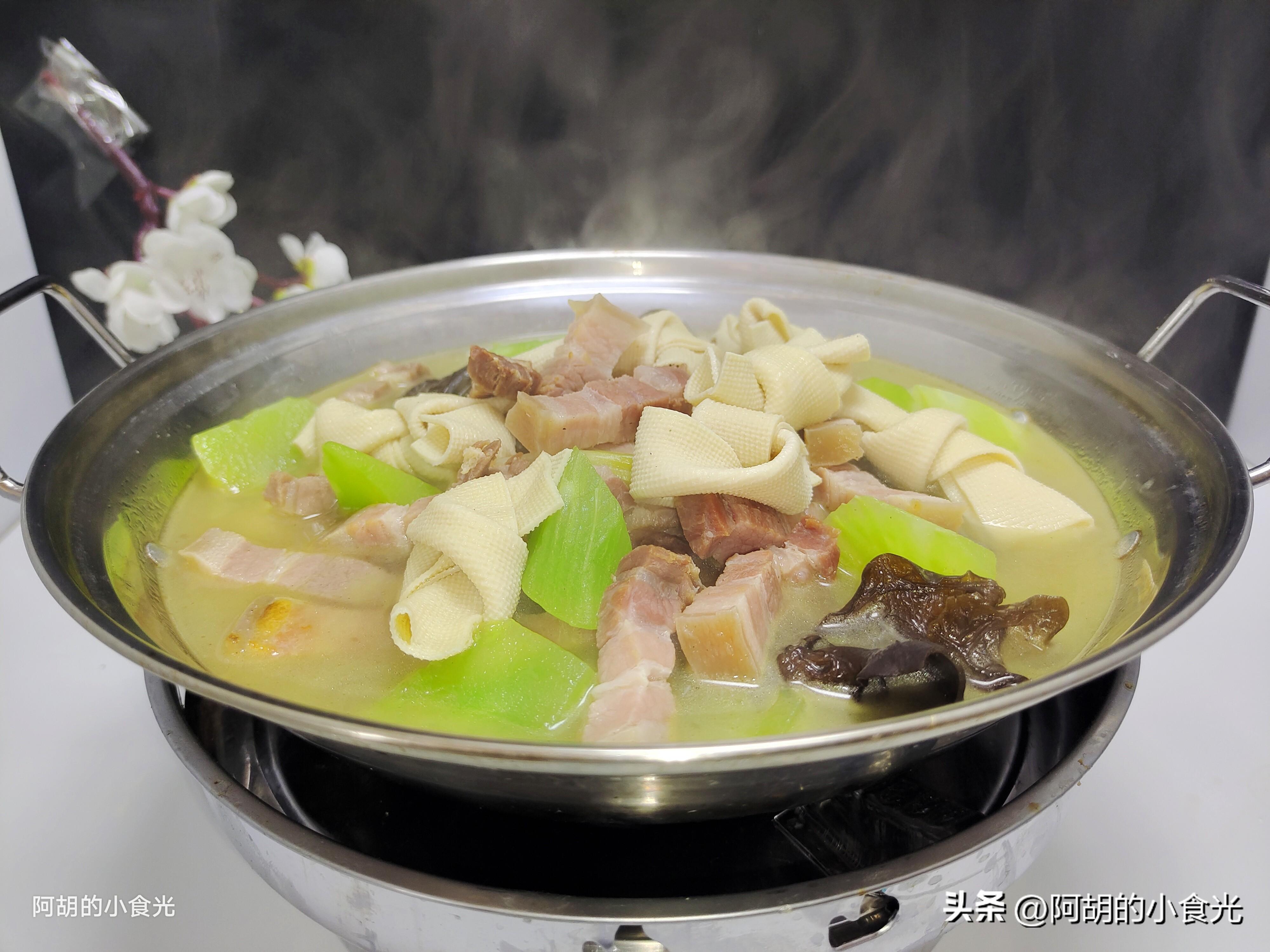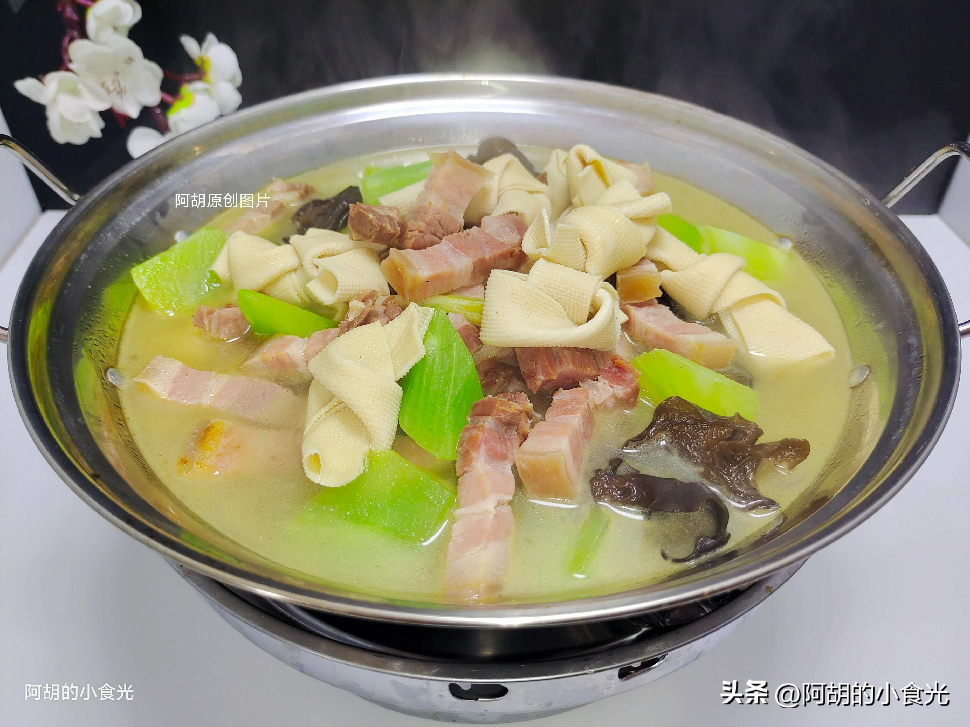第四步:轉爲最大火煮一煮,讓湯汁呈現一些白色。而後把千張結、木耳和萵筍一塊倒入湯汁中,就這樣保持大火加蓋燉煮10分鐘左右,讓鹹肉的鹹香和各食材的鮮味充分地釋放出來。