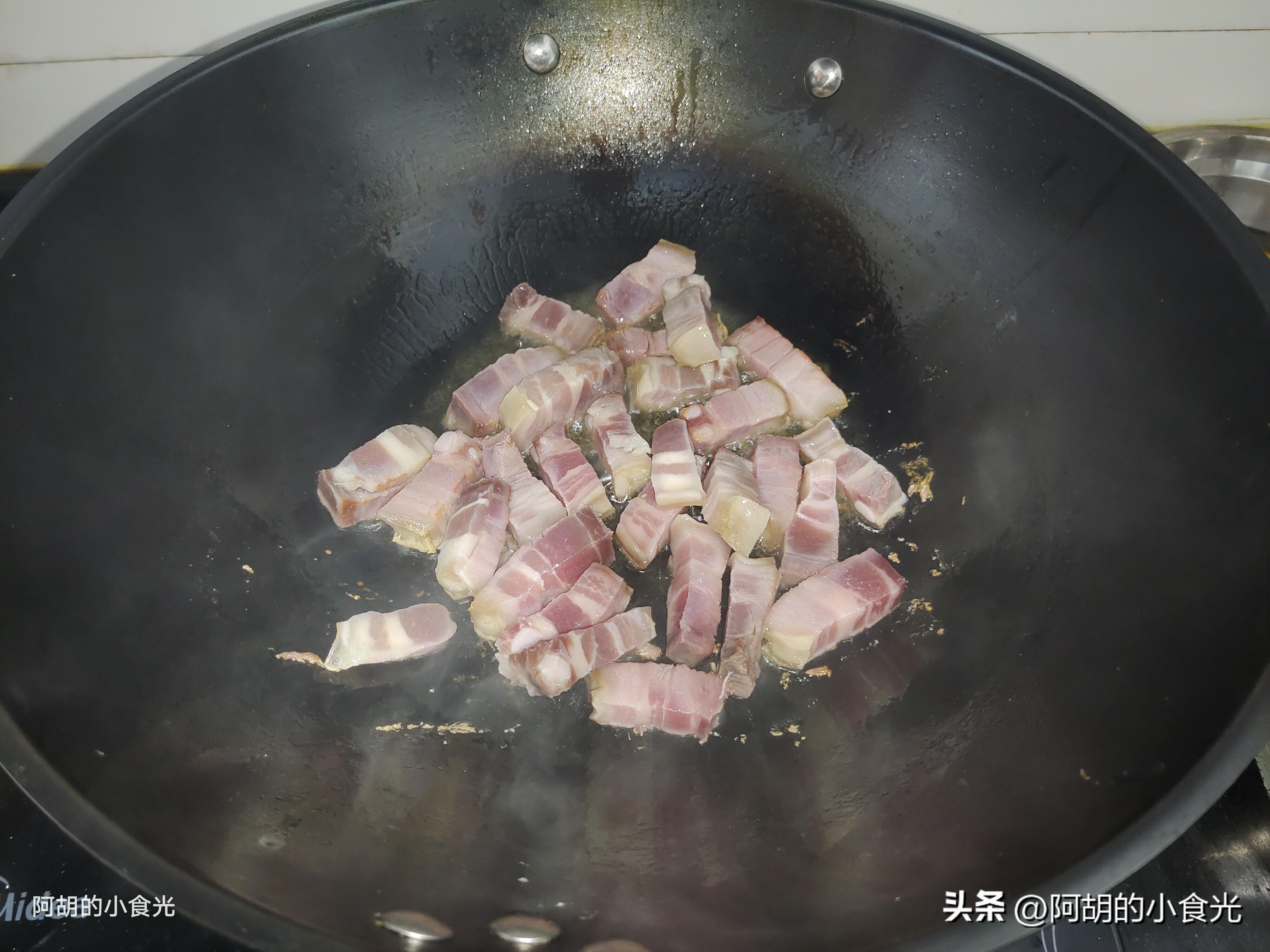 第三步:所有食材備好後就可以開火烹飪了。先打火把鍋烘乾,淋入一些菜籽油改爲小火燒熱,先把鹹肉塊倒入鍋中煸炒出香味,至其完全變色後加入蔥姜炒出香味,而後準備一些開水直接衝入鍋中,記住一定要開水。