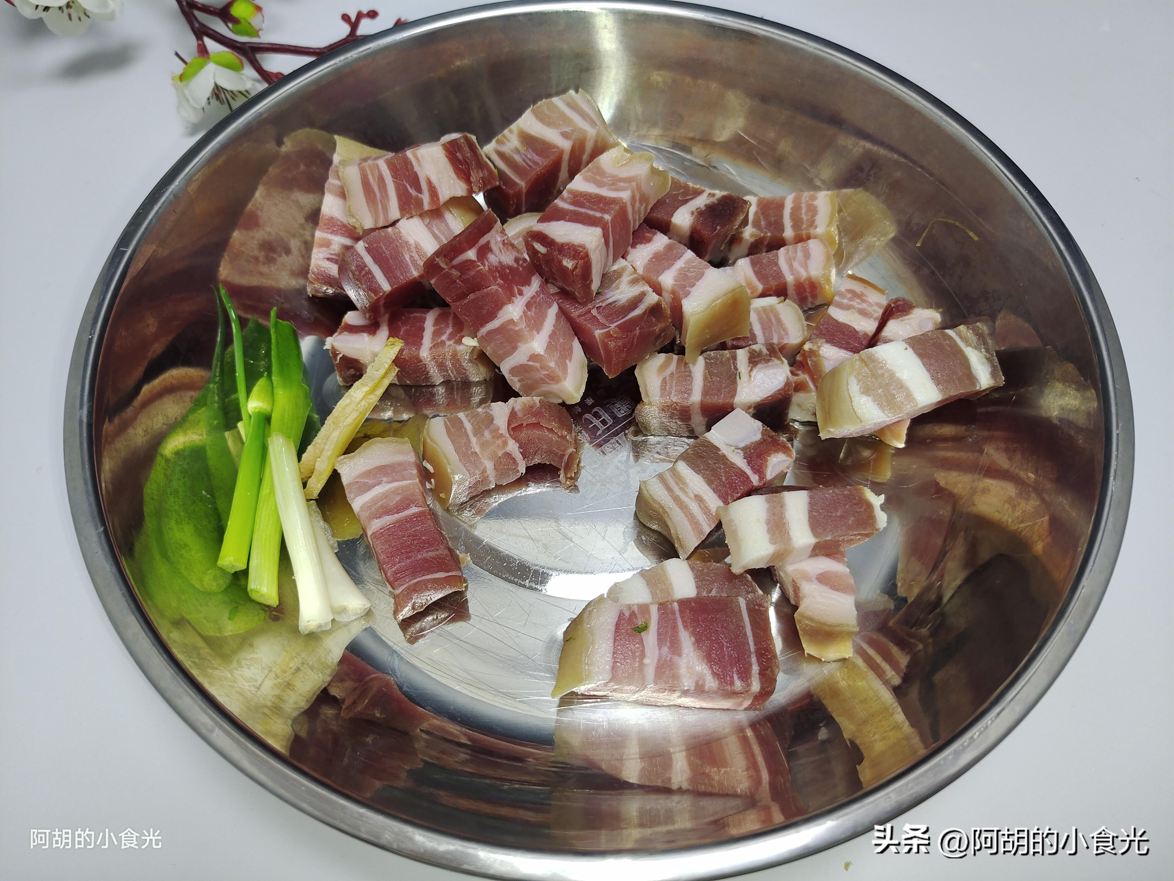 第二步:準備一塊風乾鹹肉,將其切成塊備用。鹹肉就是用食鹽醃製的五花肉,再風乾後得來的,含有大量的鹽分,可以先用清水泡一泡去除一些鹽分。但是這道菜也可以不用浸泡,畢竟是一道湯菜,需要加入大量的水來燉。小料就簡單搭配一些蔥姜即可。