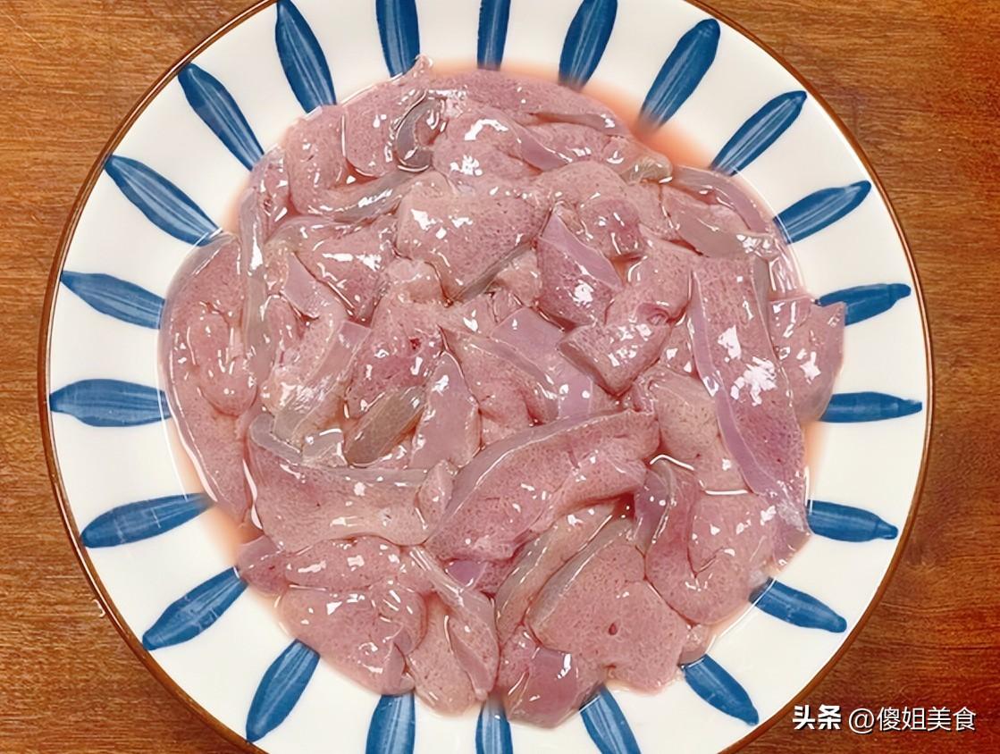 第三步:切好的豬肝放碗裏,加一勺料酒、一點點鹽,用手抓勻,醃個十來分鐘,這一步是爲了去腥,也讓豬肝有個底味。這裏有個小竅門——醃的時候不要加澱粉。很多人怕豬肝炒老了喜歡裹澱粉,但其實火候到了不裹澱粉一樣嫩,裹了反倒容易糊鍋,影響口感。