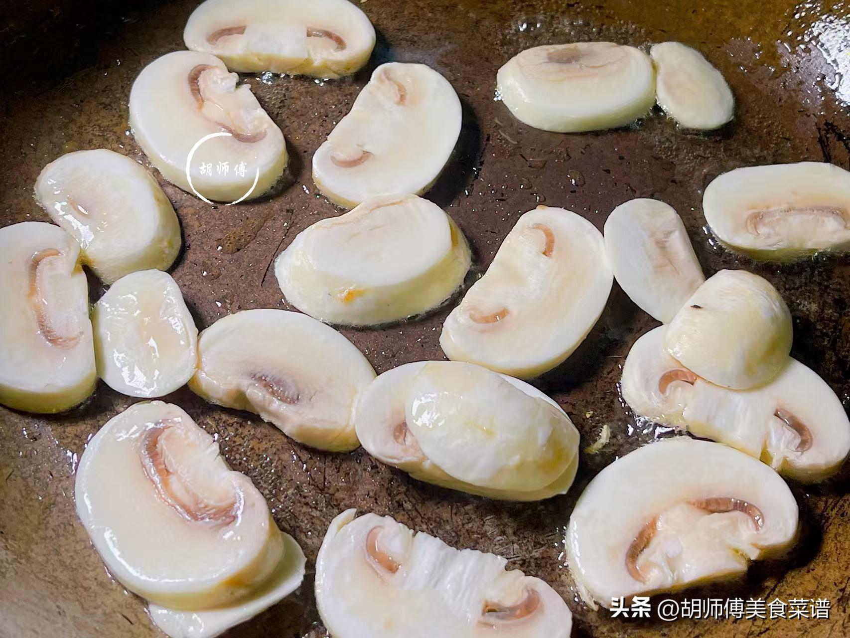 第四步:鍋中放入少許油,然後把切好的口蘑片放入鍋中,大火炒1分鐘,激發出口蘑片的香味即可起鍋備用。