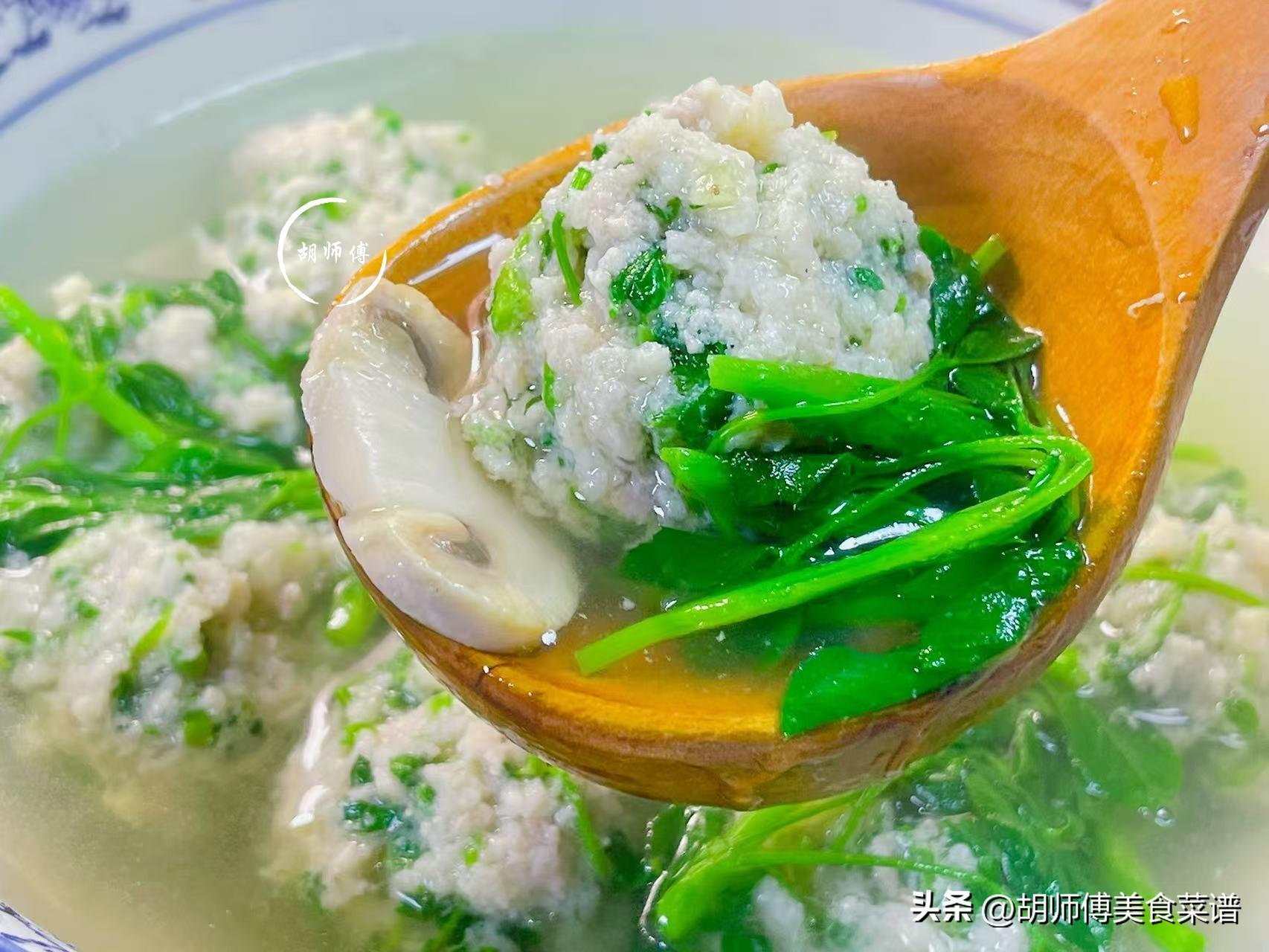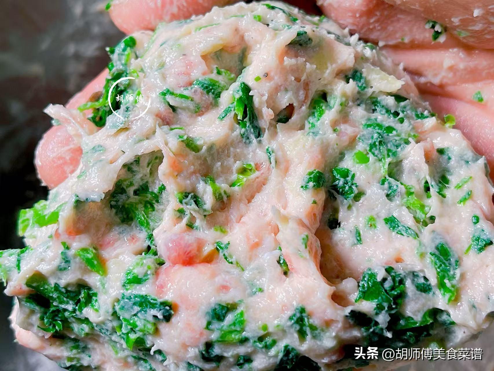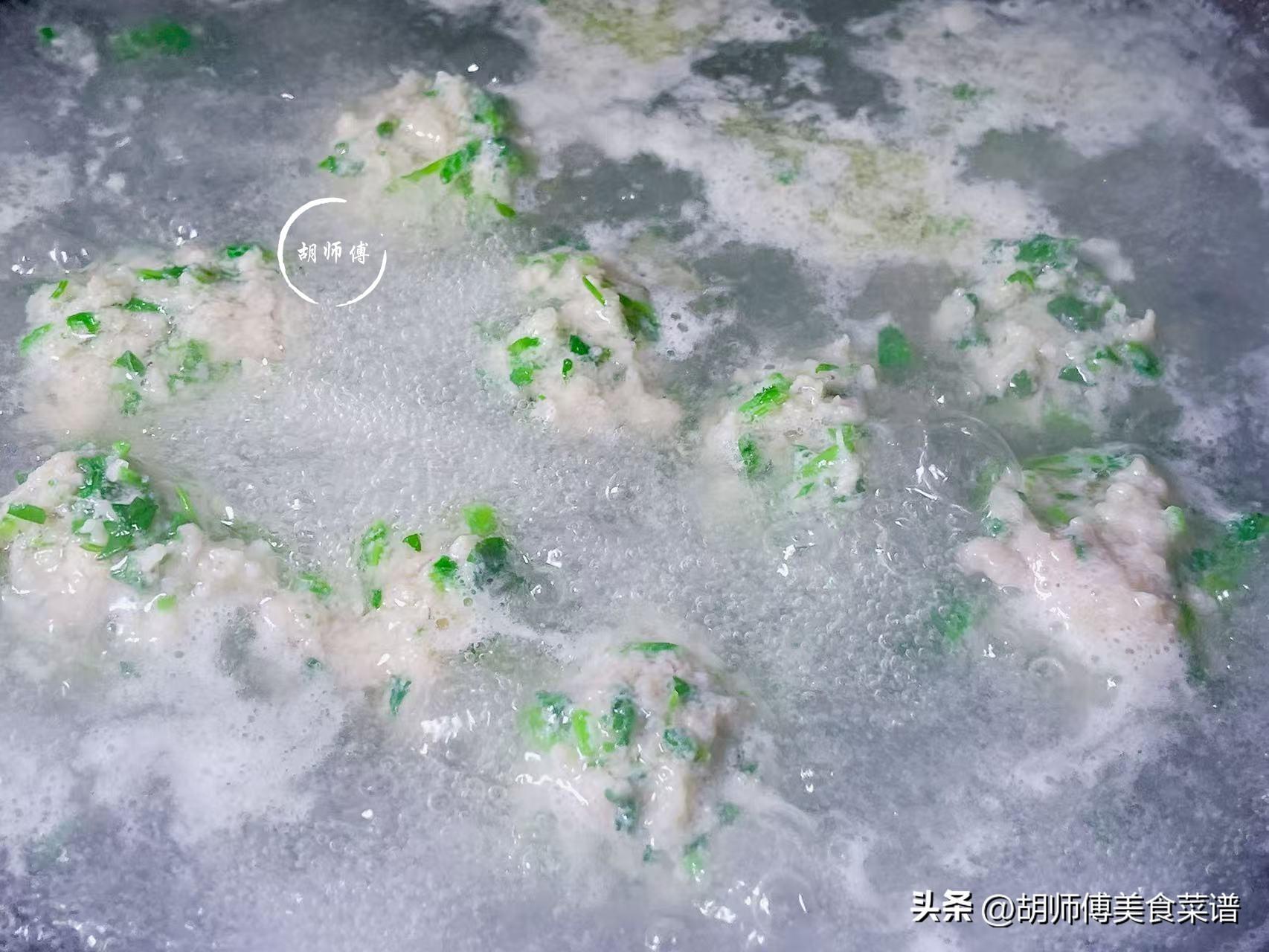 2、做苜蓿肉丸時,肉餡攪拌的時間一定要足,如果肉餡攪拌的時間不足,肉丸下鍋後就會散,攪拌足的肉丸,煮出來會非常圓。