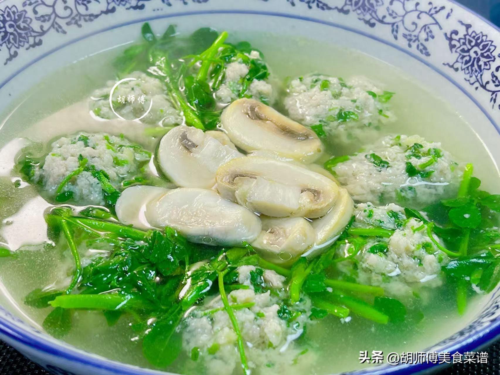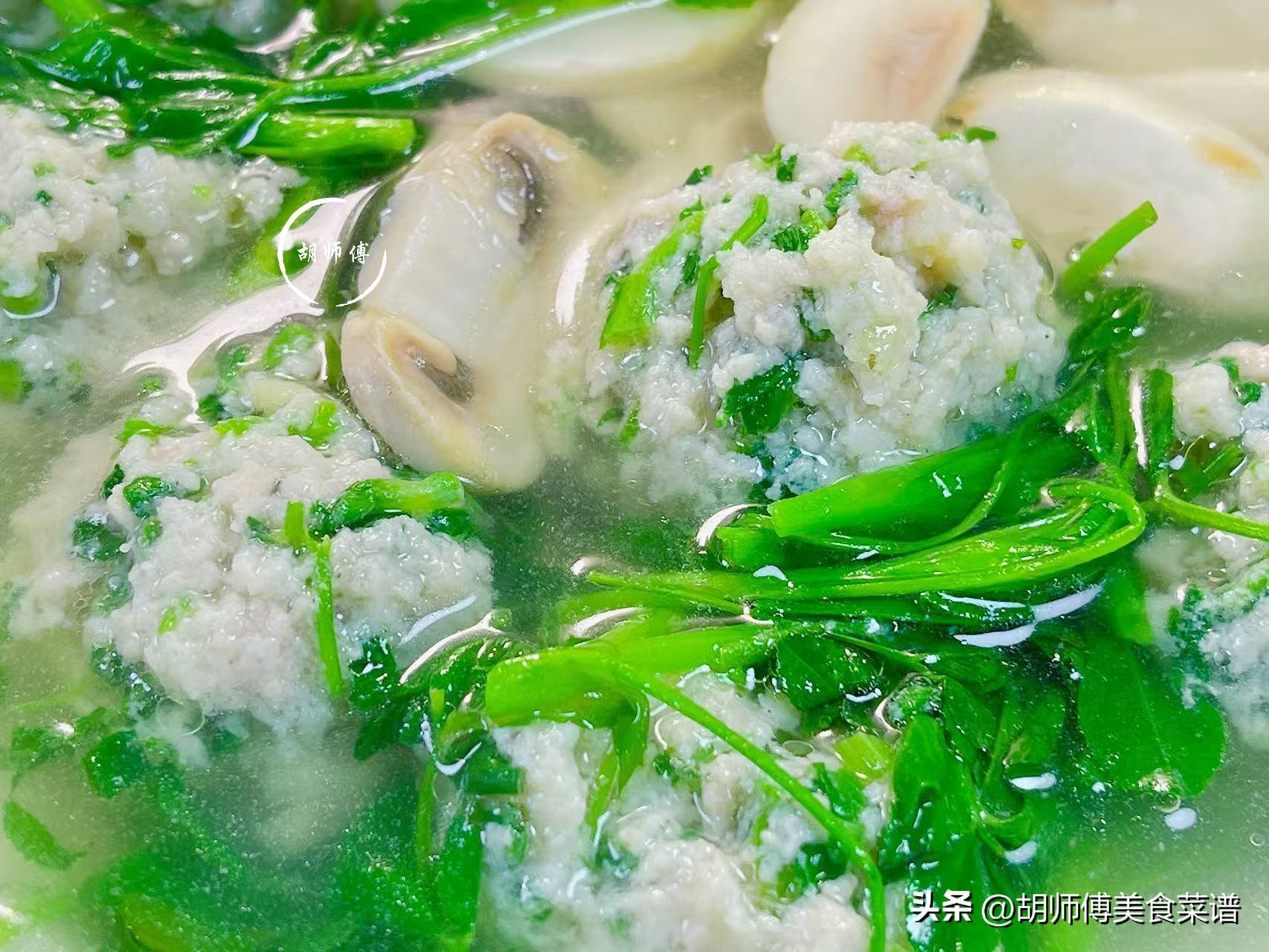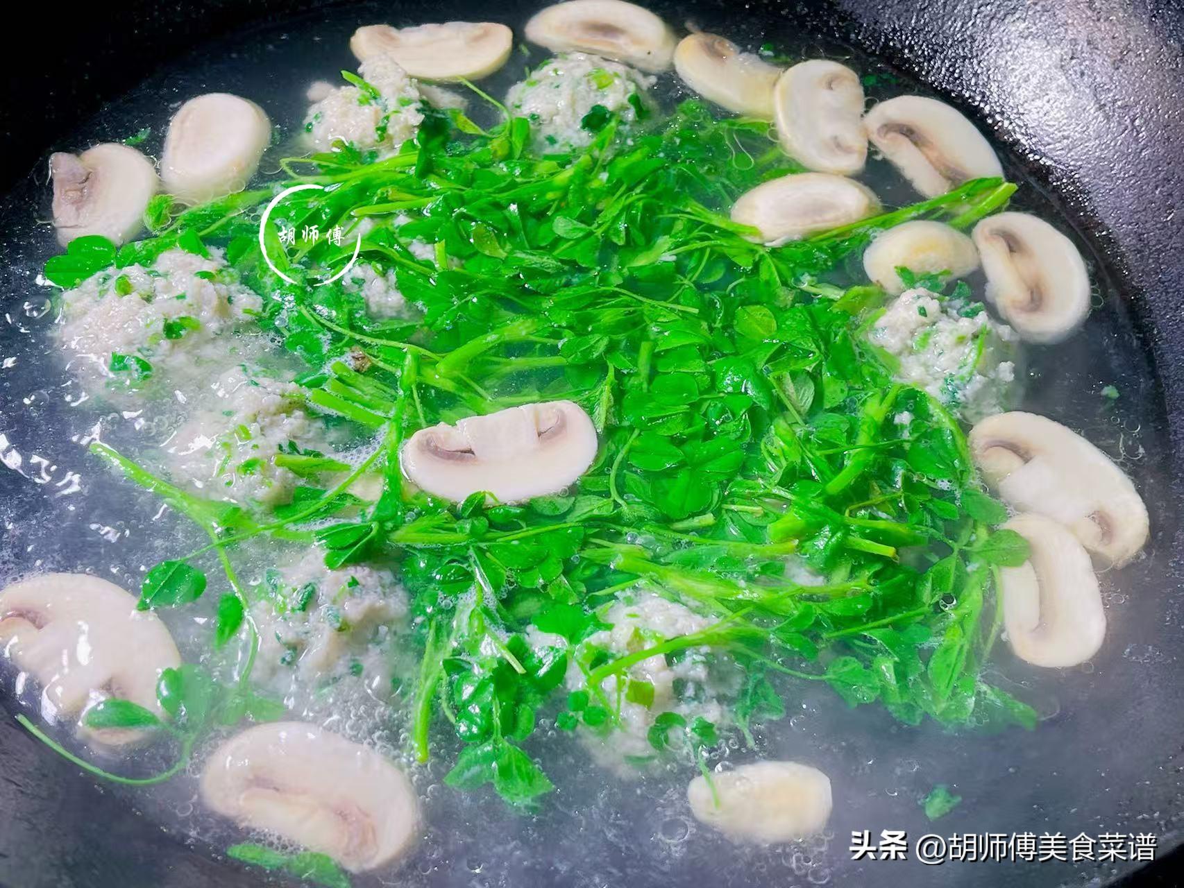 第六步:將炒好的口蘑片、另一半苜蓿、食鹽、胡椒粉放入鍋中,大火將水煮沸後即可起鍋食用。做好的苜蓿肉丸湯,趁熱喫,超級鮮美。