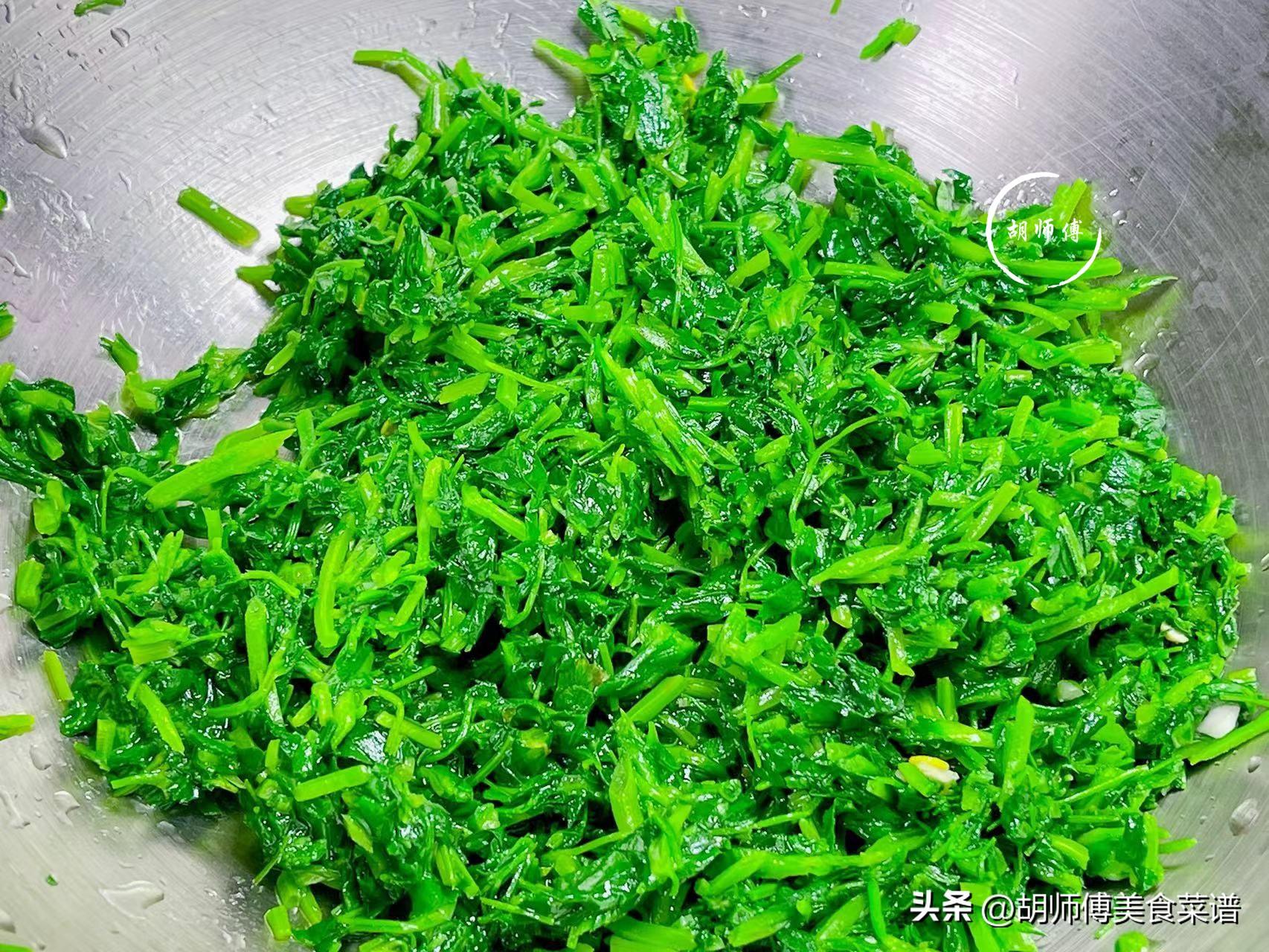 第二步:將苜蓿分成均勻的2份,然後將一半苜蓿放入砧板上切成碎末後,接着撒上一點點食鹽攪拌均勻,大概將苜蓿醃製3分鐘後,用力將苜蓿中的水擠幹即可備用。