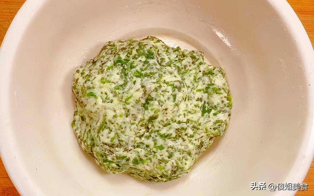 摘好的艾草洗乾淨,鍋裏燒開水,放進去焯一下,撈出來過涼水,攥幹水分,然後剁碎。剁的時候那股香味更濃了,刀起刀落間,春天的味道就這麼被鎖進了這一堆綠綠的碎末裏。