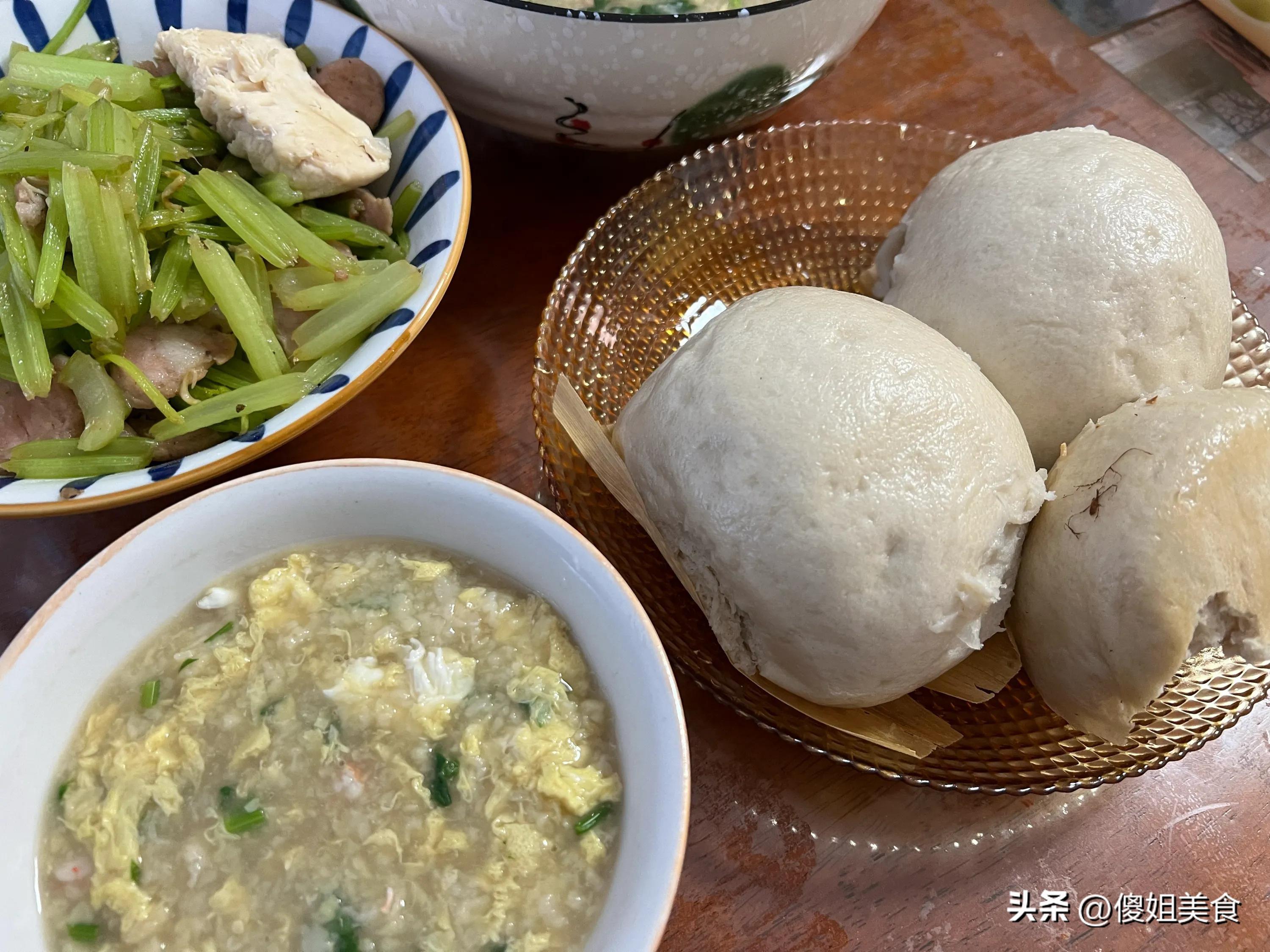 第三步:最後就是主食啦,我們家很少在外面買饅頭,基本都是自己蒸。趁着週末有空的時候,多蒸一些,涼透了放冰箱冷凍室。想喫的時候,提前化凍,拿出來熱一下,和新蒸的一樣好喫,還特別方便。