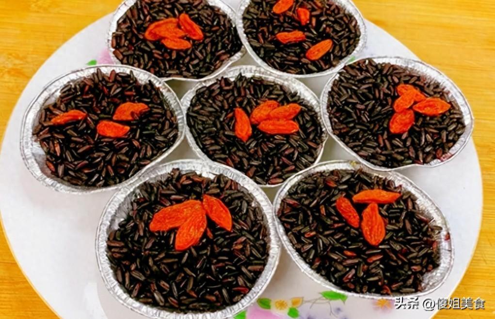 蒸好的黑米趁熱倒入大碗裏,加入一勺槐花蜜、少許白糖調味,這時候整個廚房都是香甜的味道。取一小團黑米,裝入蛋撻小碗中,壓緊實一點,撒上適量枸杞,放入鍋中蒸8-10分鐘即可。