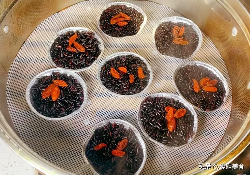 黑米提前泡一晚上,這一步不能省,不然蒸出來會硬心,泡好的黑米瀝乾水分,上鍋蒸熟,大概30分鐘左右。