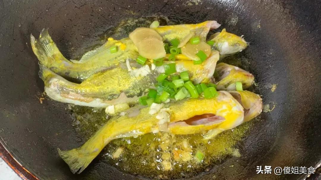鍋裏倒上適量的油,油熱了之後,把薑片和蔥段放進去爆香。然後把黃骨魚一條一條地放進去,小火慢煎。不要着急翻動,等一面煎到金黃定型了,再翻到另一面。兩面都煎得微微發黃,魚皮有點焦脆的時候,香味就出來了。