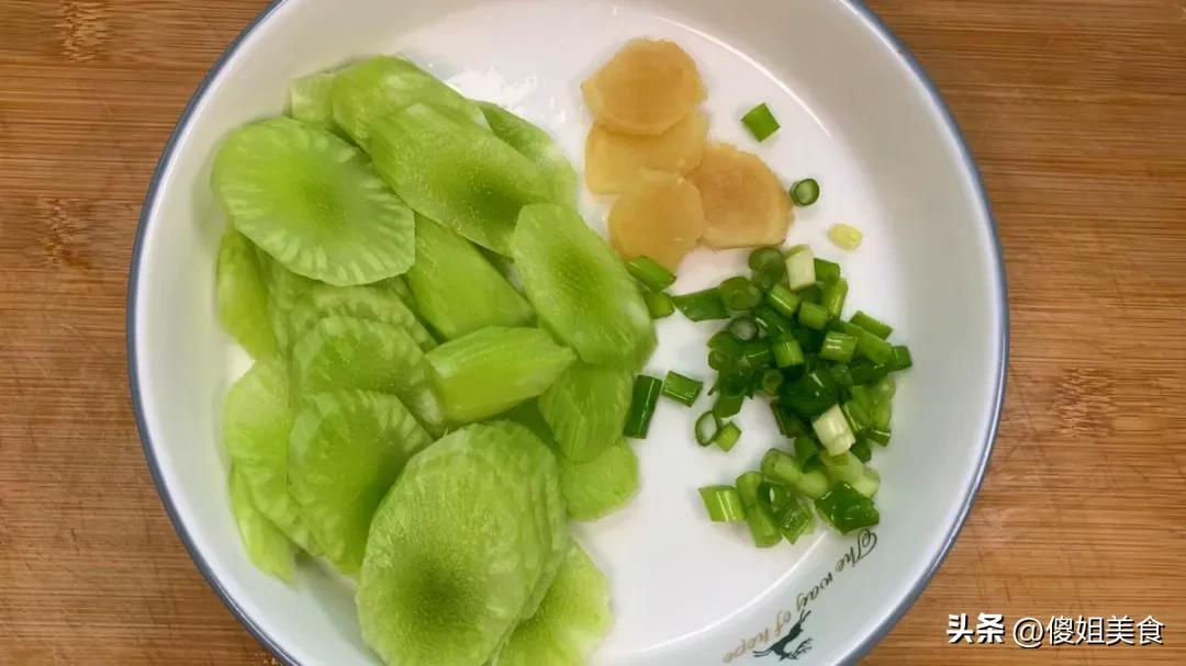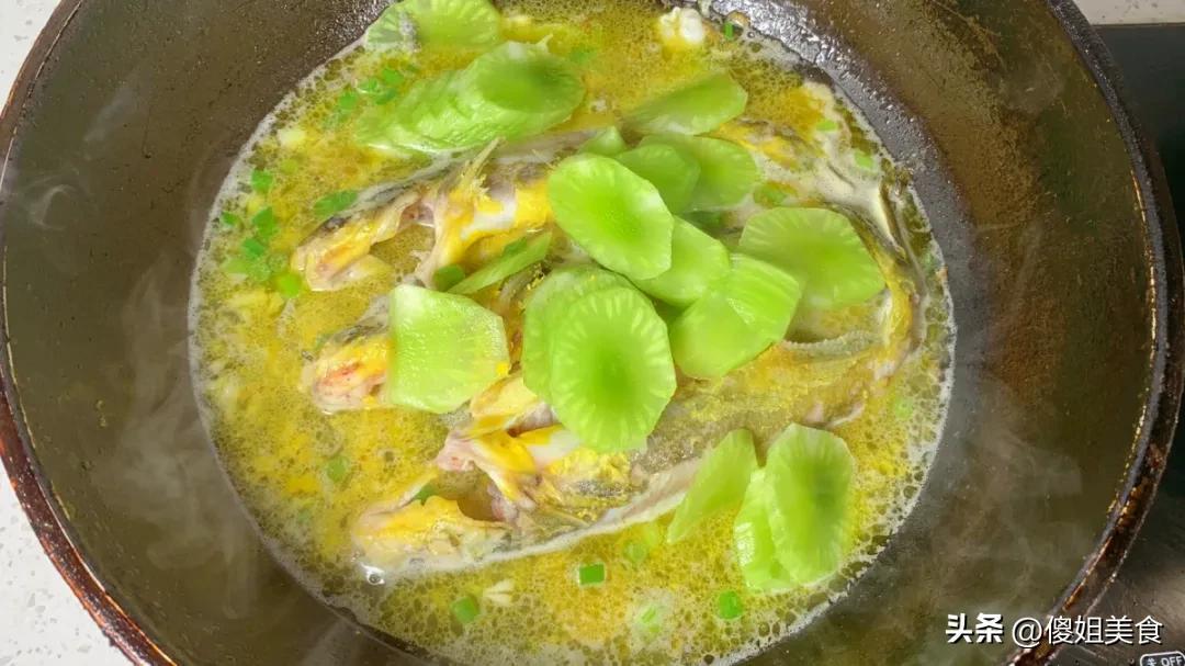 趁着燉魚的功夫,把萵苣削去皮,切成薄片。等魚湯燉得差不多了,把萵苣片放進去,再燉5分鐘。萵苣很容易熟,不用燉太久,保持脆嫩的口感最好。