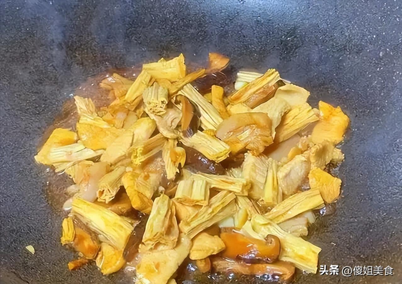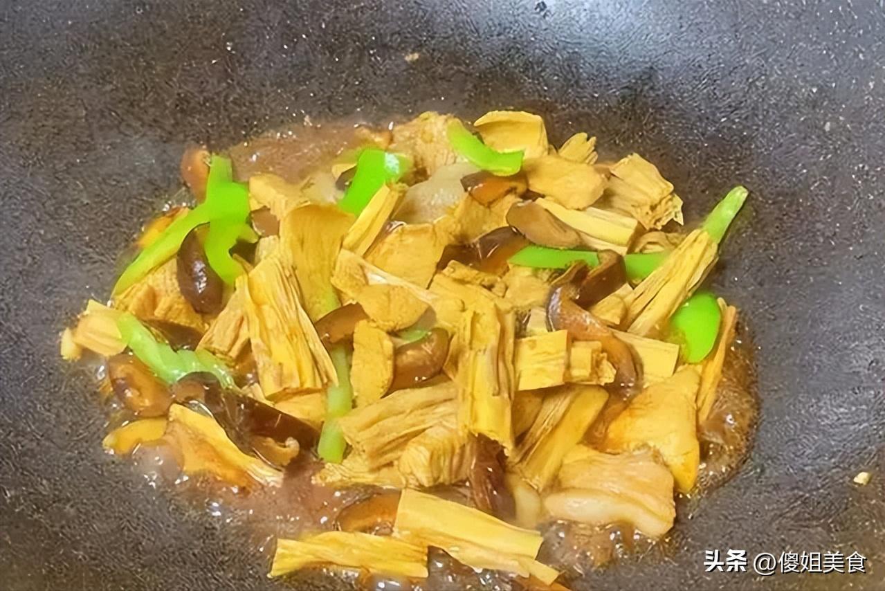 ◦ 然後把腐竹段也倒進去,繼續翻炒。這時候可以加點剛纔泡香菇的水,別太多,小半碗就行,讓腐竹和香菇在湯汁裏稍微燜一下,更入味。我每次都會多燜一會兒,讓腐竹吸飽湯汁。