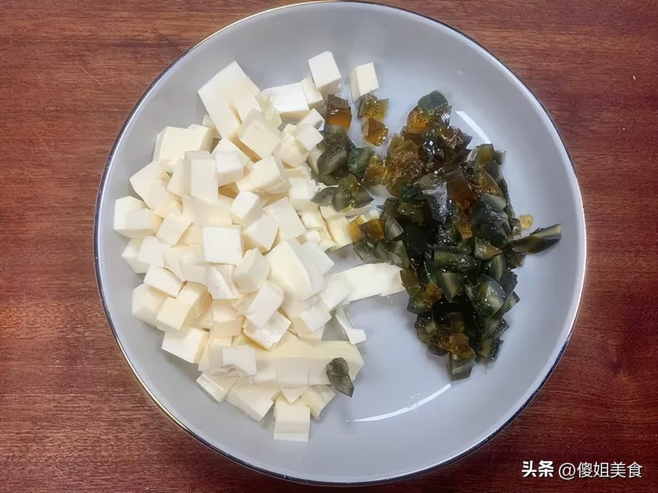 1. 嫩豆腐取出,用刀切成1釐米見方的小丁,放入裝有清水的碗中浸泡,防止豆腐粘連或破碎。