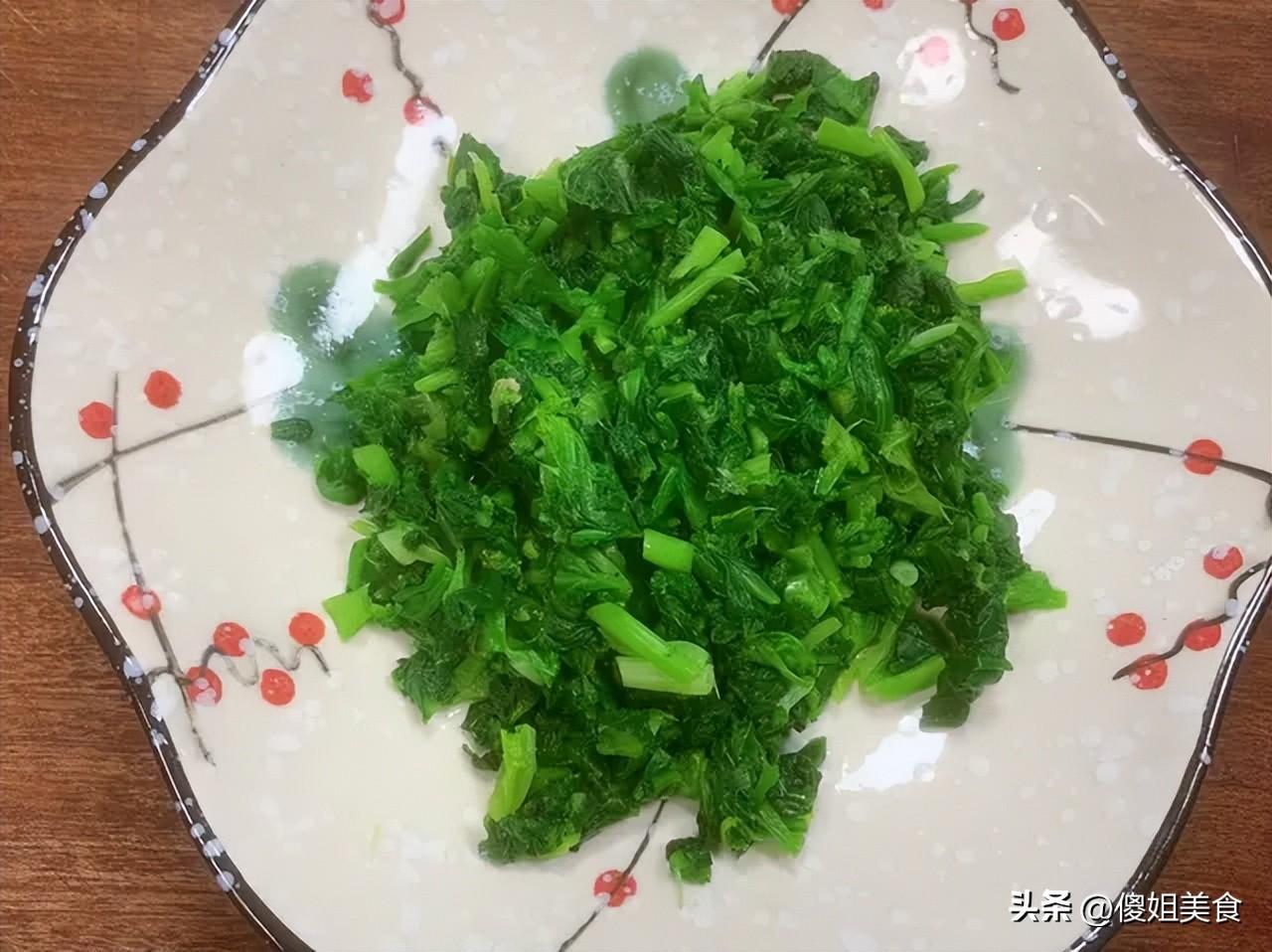 3. 把焯好的薺菜放入涼水中過涼,擠幹多餘水分,放在案板上切成細碎的薺菜末,裝盤備用。