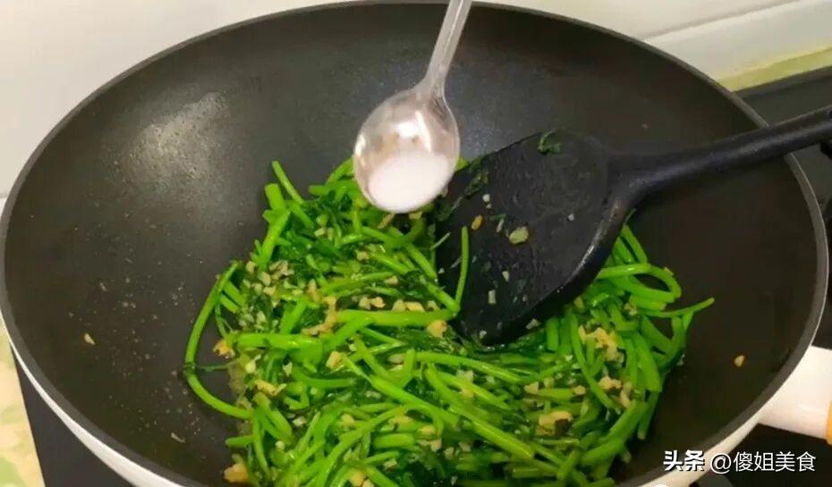 緊接着把茼蒿葉倒進鍋裏,繼續大火快炒。這一步要更快,葉子很容易熟,炒久了就發黃出水,口感發蔫。大概30秒到1分鐘,看到葉子變軟、顏色變深綠,就可以調味了。