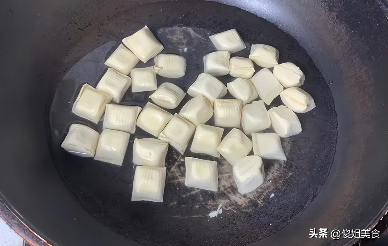 鍋裏倒點油,油熱了之後,把豆腐泡一個個放進去,中小火慢慢煎。煎到兩面都有點金黃,表皮有點皺巴巴的就可以了。這一步是關鍵,煎過的豆腐泡,外皮會有點韌勁,裏面還是軟嫩的,口感層次一下就上來了。