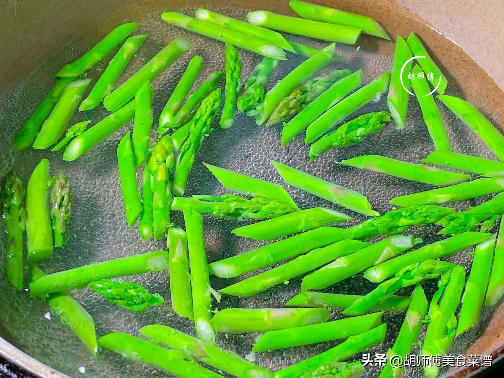 第二步:鍋中放入適量水,等水煮沸後,滴3滴油到鍋中,然後把蘆筍放入鍋中,大火焯水半分鐘後撈出立即過涼水,等蘆筍完全冷卻後即可撈出備用。